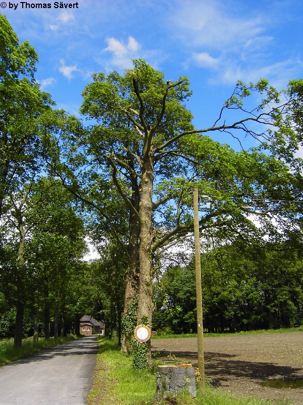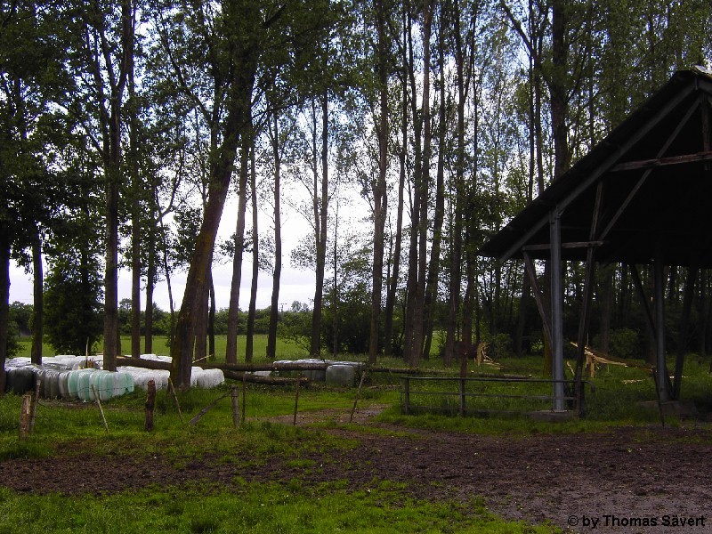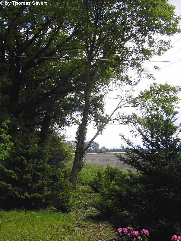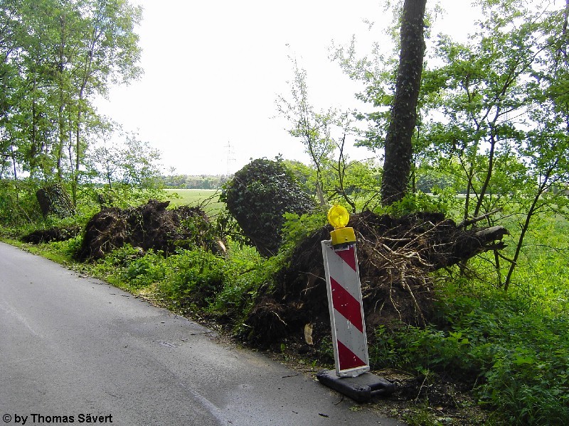 | An der Allee zum Gut wurden insgesamt 7 alte Bäume zerstört, darunter Eichen und eine Rotbuche. Der erste Baum (Eiche) der rechten Reihe brach in etwa 4 Meter Höhe ab und der obere Teil des Baumes landete etwa 70 Meter weiter am Gut. Auch ein Andenken an den Zweiten Weltkrieg an der Allee wurde zerstört: Ein Panzer war gegen einen der Bäume gefahren, der seitdem schief stand, aber als Erinnerung stehen gelassen wurde. Er überstand alle Stürme bis zum 20. Mai 2006, als er umstürzte. Vom Gut aus konnten die Bewohner den herannahenden Tornado sehen, sie beschrieben ihn als sich drehenden Schlauch: "Ich kenne sowas nur aus dem Fernsehen und ich dachte, sowas gibt es nur in Amerika." | |