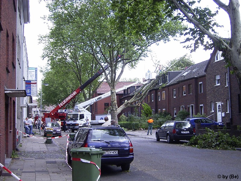 Es war ein Sonntagabend. Viele Einzelheiten, die dieses außergewöhnliche Wetterereignis mit sich brachten, werde ich wohl nicht mehr vergessen. Den ganzen Tag habe ich mich auf einen unterhaltsamen Fernsehabend gefreut. Da, wie bereits geschrieben, die Wetterprognosen indirekt von Aktivitäten im Freien abrieten, Gewitter gab es schon am Freitagabend, machte ich es mir in meinem Wohnzimmer bequem. Das Unwetter kündigte sich bereits um kurz nach 21.00 Uhr an. Blitze zuckten über den Himmel. Gegen 21.20 Uhr zeigte sich der Himmel über Duisburg pechschwarz. Ein Schwarz, dass ich vor einem Gewitter so noch nie gesehen habe. Um diesen Eindruck besser zu verdeutlichen folgende Erklärung: Selbst ein mondloser, aber sternklarer Nachthimmel ist im Ruhrgebiet nicht ganz schwarz. Restlicht unserer Stadtbeleuchtung erhellt den Himmel immer so, dass Hausdächer sich dunkel vor dem Nachthimmel in Umrissen abzeichnen. Dieser Himmel war aber so schwarz, dass selbst Hausdächer nicht mehr als Umrisse zu sehen waren. Ob die Dämmerung nun schon eingesetzt hatte, war in diesem recht seltsamen diffusen Licht nicht mehr zu erkennen. Die weiße Fassade des etwa 50 Meter entfernten Hauses auf der anderen Seite des Wohnblocks leuchtete geradezu im Restlicht des Tages. Dahinter war die besagte rabenschwarze Wand zu sehen, ohne das man weitere Strukturen erkennen konnte. Der Himmel war insgesamt bedeckt, dass man auch keine Wolkentürme oder Ähnliches ausmachen konnte. Dieses Schwarz fesselte meine Aufmerksamkeit. Da schien sich ein kräftiges Gewitter mit starken Niederschlägen und Sturmböen anzukündigen. Alle losen Gegenstände holte ich vom Balkon; Fenster sowie Türen schließen und Rollos herunterlassen schien mir nun sinnvoll zu sein. Unser Sohn, der üblicherweise spätesten um 20.00 Uhr im Bett liegt, schlief tief und fest und sollte durch ein Unwetter, das man bei offenem Fenster sicher hört, nicht geweckt werden. Ich leistete mir den Luxus, das Rollo vor der Balkontüre nicht zu schließen um die Wetterentwicklung weiterhin beobachten zu können. Gelegentlich öffnete ich die Türe, um die Wetterentwicklung weiterhin genauer sehen zu können. Mit einem Mal, es war ca 21.25 Uhr hörte ich ein Rauschen, dass sich binnen kürzester Zeit zu einem Geräusch entwickelte, das einem herannahenden Schnellzug ähnelte. Dann flogen auch schon Äste, Müll und anderes unidentifizierbares Zeug durch die Luft. Durch den Flug einiger Holzbretter irritiert dachte ich in diesem Augenblick an die Kuh aus dem Kinofilm "Twister". Trotz dieses kurzen Gedankenblitzes ignorierte ich die Möglichkeit, dass es sich hier um einen Tornado handeln könnte. Ich dachte eher an sehr starke Scherwinde, die bei Unwettern häufig mal auftraten. Das ganze optische Chaos schien aber nicht aufhören zu wollen. Im Gegenteil! Plötzlich wurden die Kronen der Alleebäume, die Platanen, die erst vor zwei Jahren heruntergeschnitten wurden, vom Wind um die Hälfte heruntergedrückt. Die Kronen hatten schon wieder eine beachtliche Größe, da Platanen sehr schnell wachsen. Die langen Äste, die sich wie schmale Finger meterlang in den Himmel recken, wurden fast alle auf das Niveau des Hauptstammes herunter gedrückt. Dabei peitschten die Äste so gegeneinander, so dass viele auch einfach abbrachen. Plötzlich sah ich zwei Männer die Allee herunterrennen. Nach kurzem Sprint drehten sie sich um, um dann weiter zu rennen. Ein recht massiv gebautes Gartenhaus von etwa 3 x 3 Meter Größe mit einem Giebeldach wurde im Garten gegenüber seitlich um mindestens einen Meter angehoben. Es sah so aus, als ob das ganze Haus gleich davon rollen wollte. Alles passiert parallel zu meinem Fenster von Westen nach Osten. Trümmerteile flogen nicht auf mich zu, sondern einfach nur vorbei. Ich sah weder einen Trichter noch nahm ich eine Drehbewegung war. Alles flog einfach nur mit einer Urgewalt an unserem Fenster vorbei. Ich hörte durch die Doppelverglasung das Krachen und Brechen von Holz. Ein kleiner Pflaumenbaum, der im Garten stand, wurde entwurzelt. Das bisher beschriebene Chaos waren Momentaufnahmen der vielleicht ersten 5 Sekunden. Mir reichte es. Mit einem Krachen ließ ich das Rollo vor der Balkontüre herunter und lief ins Kinderzimmer. Meine Frau lief in die Küche um dort aus dem Fenster zu sehen. Die Dixitoilette flog um die zwei Bauwagen herum um auf der Rückseite des zweiten Wagens liegen zu bleiben und Teile der Baustellenabsperung flogen durch die Luft und landeten in einem Mercedes. Die Bauwagen verschoben sich leicht, blieben aber stehen. Ziegel flogen von den Dächern auf die Strasse, einer durchschlug eine Frontscheibe eines PKW´s und ein zweiter Ziegel durchschlug das Stoffdach eines abgestellten Cabrio. Trotz des Getöses schlief mein Sohn tief und fest. Bereit ihn, beim kleinsten Anzeichen von Beschädigungen am Rollo oder Fenster, aus dem Bett zu nehmen und ins Badezimmer zu flüchten (einziger Raum ohne Fenster), stand ich vor dem Hochbett und hörte auf das klappern der Rollos. Langsam legte sich die Geräuschkulisse. Wie lange dieses Ereignis nun dauert kann ich überhaupt nicht abschätzen. Starkregen setzte aber unmittelbar danach ein und in kürzester Zeit entwickelten sich rechts und links der Strasse reißende Bäche, die in die Kanalisation stürzten. Irgendwann war dann der ganze Spuk vorbei und fast alle Menschen gingen auf die Strasse um sich die Schäden anzuschauen. An unserem Haus klaffte ein 2 x 3 Meter großes Loch im Dach. Die Dachantenne war teilweise weggerissen; die Reste hingen schief herunter. Von den Balkonkästen in der zweiten Etage fehlte jede Spur. Eine Birke vor unserem Haus wurde entwurzelt. Vom Nachbargrundstück waren Bäume auf eine der Doppelgaragen gestürzt und hatten Teile aus dem Teerdach geschlagen. Das Nachbargrundstück hatte einen großen Baumbestand darunter vier große Pappeln ca. 18 bis 22 Meter hoch. Drei dieser Bäume waren in 10 Meter Höhe einfach abgedreht worden. Die Kronen l