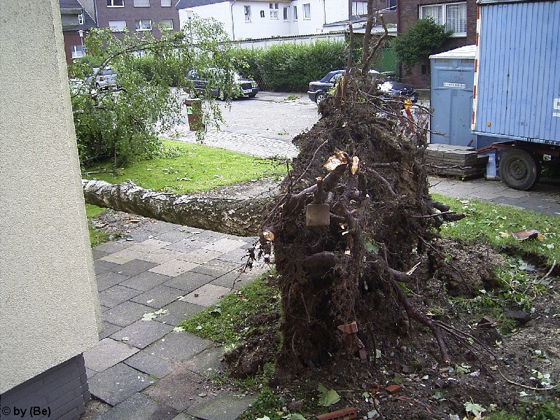 In dieser Nacht war es schwer, überhaupt in den Schlaf zu kommen. Die Feuerwehr war mitten in der Nacht schon damit beschäftigt, die Bäume von den Strassen mit Hilfe von Kettensägen zu beseitigen. Am Montag hieß es dann, dass wohl ein Tornado mit der Kategorie F2 Duisburg und Oberhausen getroffen hätte und dort z.T. schwere Zerstörung verursacht habe. Schweres Gerät wie Autokräne, Lastenaufzüge vieler Dachdeckerbetriebe und Abfallcontainer prägten in den nächsten vier bis sechs Wochen das Bild im Viertel. Die Laufstrecke des Tornados war anhand des Schadenverlaufs durch das Wohnviertel und die Innenstadt gut zu sehen, die Schadenränder waren klar zu erkennen. Ich war in den ersten Tagen froh, wenn ich meinem PKW aus dem Schadengebiet heraus war. Dann hatte ich zumindest ein Stück Normalität wieder und es war jedesmal bedrückend nach der Arbeit wieder in dieses Chaos hineinzufahren. Die Balkonkästen unseres Nachbarn fanden sich Tage später unter der umgestürzten Birke auf der Rückseite des Hauses. Sie mussten über das Haus geweht worden sein. Fazit: Es ist der Tageszeit (Sonntagabend etwa von 21.10 Uhr bis 21.40 Uhr), glücklichen Umständen (zufälliger Lebensablauf vieler Menschen an diesem Abend) und vorbeugenden Maßnahmen (rechtzeitiger Baumbeschnitt) zu verdanken, dass dieses Ereignis keine Menschenleben gefordert hat. Eine akute Warnkette, wenn man von den allgemeinen Warnungen der Wetterstationen absieht, hat es nicht gegeben. Obwohl wir in einem technisch hochmodernen Land leben, war es niemandem möglich, eine Warnkette in Gang zu setzten, weil die Infrastruktur zum Schutz der Bevölkerung einfach demontiert wurde. Aus meiner Sicht war ein großer Fehler die bestehenden Sirenenanlagen in Deutschland zu demontieren. Diese Anlagen hätten die Bevölkerung flächendeckend warnen können. Der (friedensgemäße) Katastrophenschutz ist Ländersache. Hier muss man aus meiner persönlichen Sicht den Verantwortlichen Vorhalten, dass sie es scheinbar vergessen haben, dass Katastrophenschutz schon vor Eintreffen des Schadenereignisses beginnt und nicht erst, wenn etwas passiert ist. Für die Zukunft kann ich unter den jetzigen Voraussetzungen nur annehmen, dass es irgendwann zu tragischen Todesfällen kommen wird, weil Menschen nicht rechtzeitig gewarnt wurden. Ich persönlich sehe bei schlechtem Wetter und aufkommenden Gewitterwolken besonders häufig und mit gemischten Gefühlen zum Himmel. (Be), 15.01.2006 Copyright der Fotos und des Berichtes: Be (Der Name des Fotografen und Autors ist der Naturgewalten-Redaktion bekannt.) |