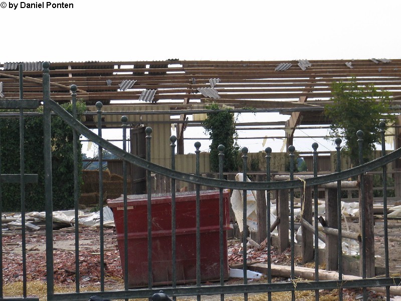 Tornado Tönisvorst am 18. Juli 2004: Dazu der Bericht von Daniel Ponten am folgenden Tag: "Ich habe den Tornado in Tönisvorst gestern abend gegen 21 Uhr aus etwa 1,5 - 2 km Entfernung gesehen. Ich beobachtete eigentlich das herannahende "Gewitter" vom Dachfenster aus, als mir in einigen hundert Metern Höhe eine merkwürdige Verwirbelung an einer Wolkenkante auffiel, merkwürdig, weil es eben nach Tornado aussah, wie man es sonst nur aus irgendwelchen Hollywood Streifen kennt. Realisiert habe ich das erst, als ich etwa 3-4 Sekunden später in knapp 2 km Entfernung am Boden eine riesige Staubwolke etwa 60-70 m aufsteigen sah. Das war der Moment in dem der Tornado verschiedene Gehöfte zwischen den beiden Stadtteilen St. Tönis und Vorst erreicht hatte und den in den Nachrichten viel erwähnten Reiterhof nahezu komplett zerstörte. Der Sturm tobte genau entlang der Landstraße auf unser Wohngebiet zu und ich tat das, was man mir mal in den USA gesagt hatte: Die wichtigsten Klamotten zusammensuchen, Taschenlampe, Papiere, Telefon und aus dem Dachboden ab in den Keller, wo ich dann etwa 5-6 Minuten ausgeharrt habe. Der Tornado ist in der Zwischenzeit in Richtung Nord-Osten weitergezogen, hat eine Bahnstrecke verwüstet und hat dann wohl 15-20 Minuten später im etwa 18 km entfernten Rumeln-Kaldenhausen (Duisburg) erhebliche Schäden verursacht. Die Zerstörungen draußen an den Bauernhöfen und den zahlreichen Alleen sind beträchtlich und die Feuerwehr ist jetzt schon fast 17 Stunden mit Aufräumungsarbeiten beschäftigt. Dem Verlauf nach müssten das irgendwie schon zwei Tornados gewesen sein, es sei denn, er hat sich zwischenzeitlich abgeschwächt, aber zwischen Kempen-Unterweiden (Bahnstrecke) und dem Nordosten von Krefeld (Richtung DU-Rumeln-Kaldenhausen) ist auch noch dicht besiedeltes Wohngebiet und große Wald-und Bruchlandschaft, da hätte er eigentlich drübergemusst und dementsprechende Schäden anrichten. Rund um den Elfrather See, im Süden von Rumeln-Kaldenhausen, aber noch auf Krefelder Stadtgebiet hat es auch schwere Schäden gegeben." | |||