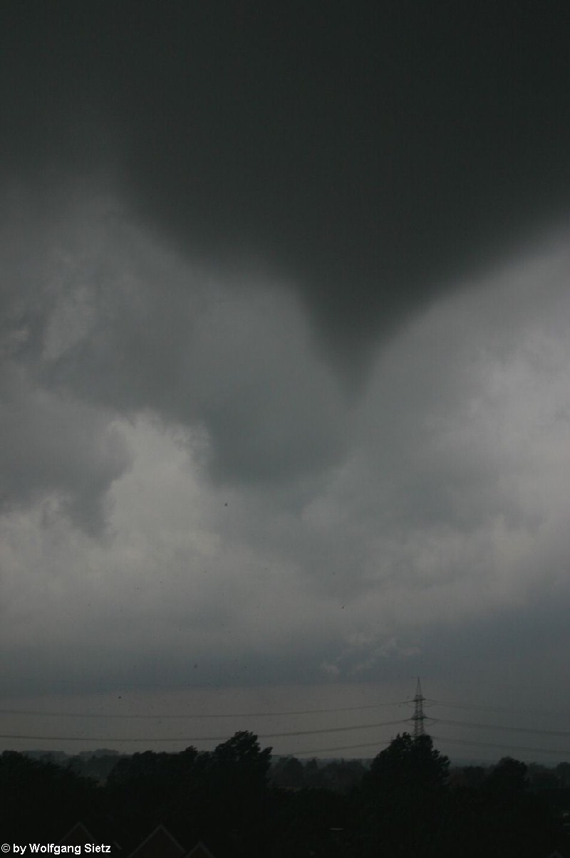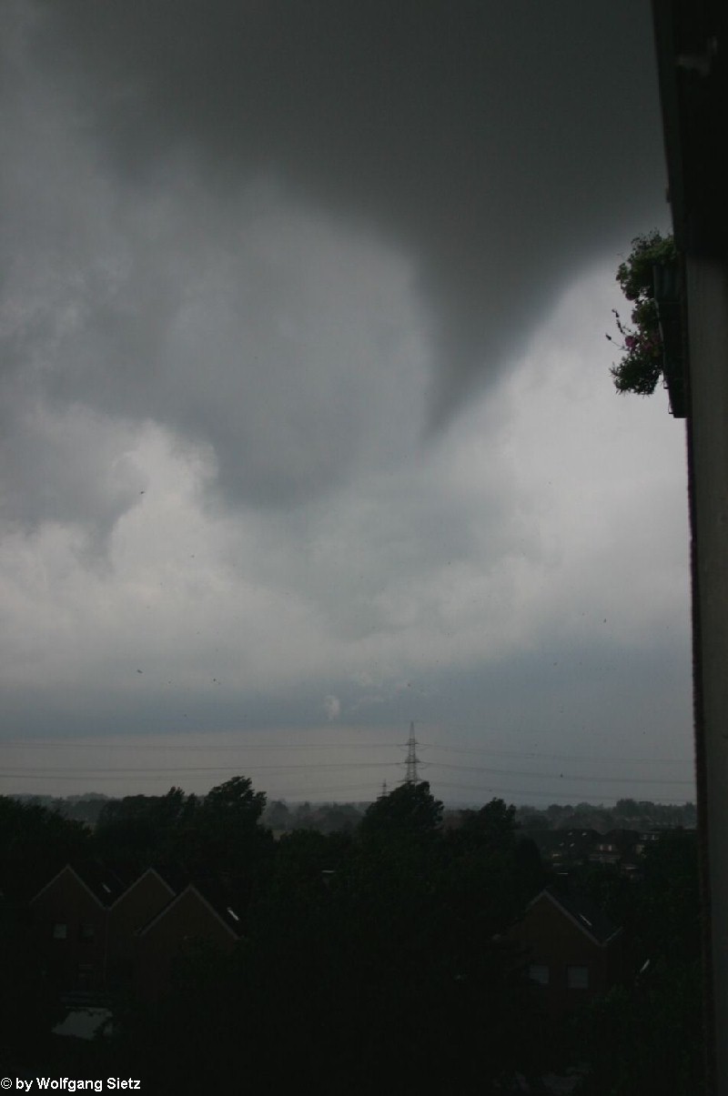 "Die Bilder entstanden um 21:03 innerhalb von 20 sec. Der Tornado ist im SW an der Ortsgrenze Krefeld-Uerdingen zu Duisburg Rumeln-Kaldenhausen im Bereich Traarer Str., Abstand ca. 300 m. Der Tornado zog nach Norden, die Bilder danach (21:08-21:21) zeigen Richtung NNO, dort ist der Tornado weiter gezogen, auf den Bildern aber nicht mehr zu erkennen."