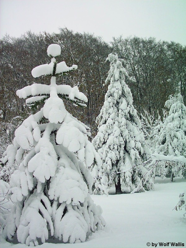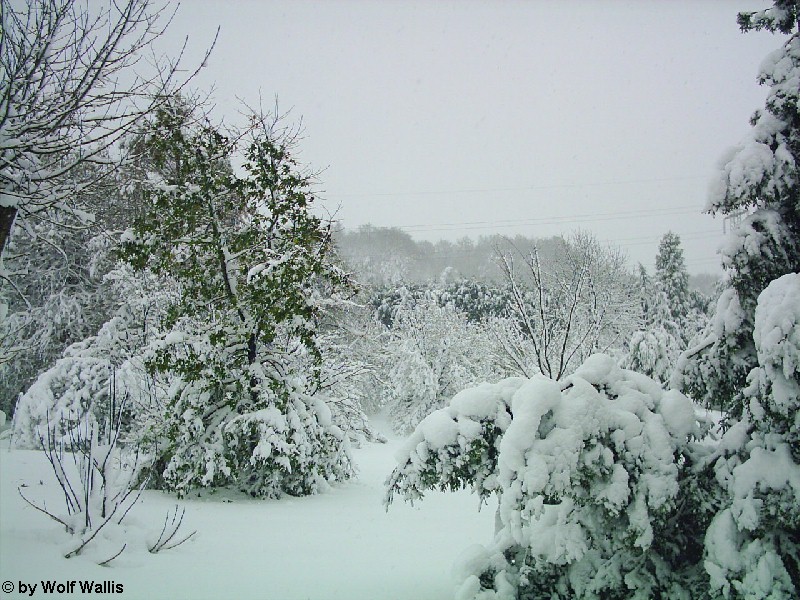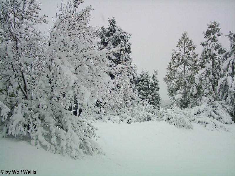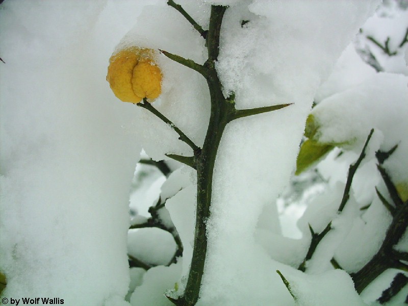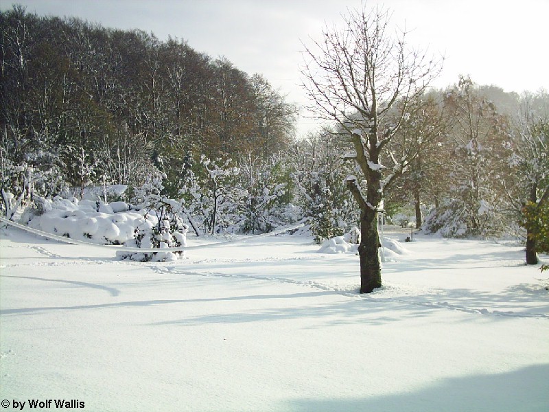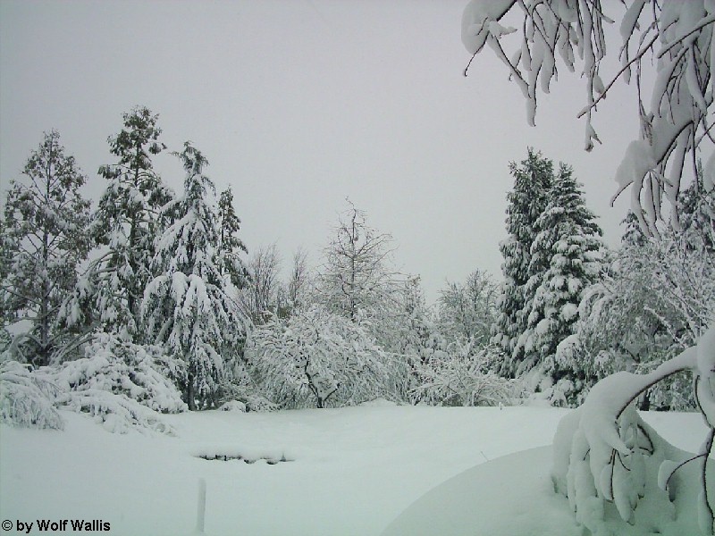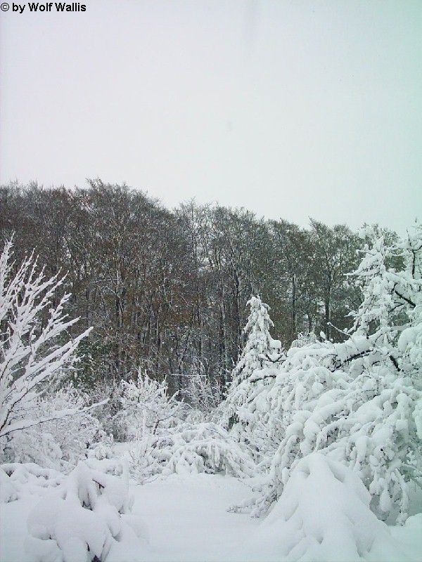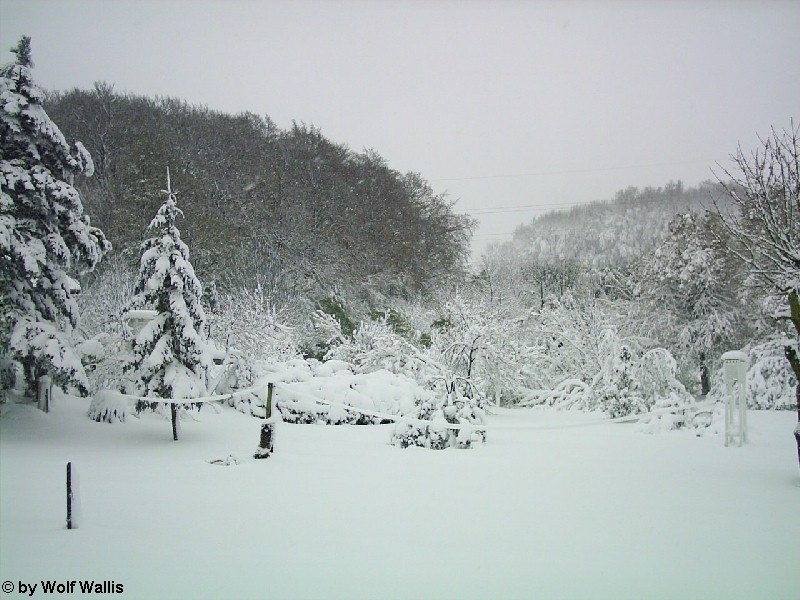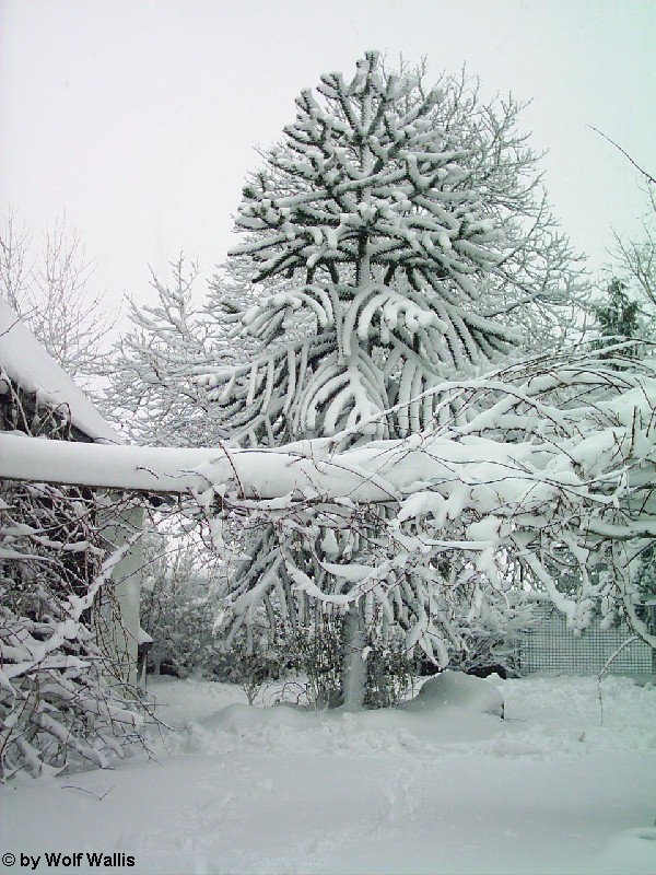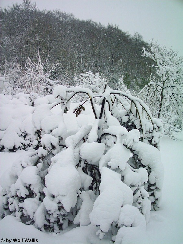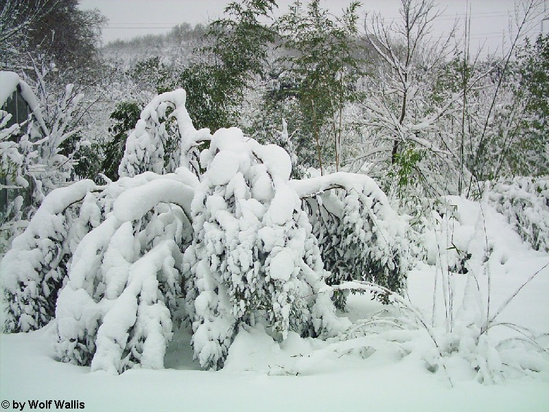 Schnee bei Osnabrück am 26./27.11.2005 Die Aufnahmen stellte Wolf Wallis zur Verfügung. Sie stammen aus dem Raum Tecklenburg, etwa 20 Kilometer westlich von Osnabrück. Die Schneehöhe lag zwischen 35 und 40 Zentimetern. An vielen Bäumen gab es Schneebruch, dies betraf vor allem Magnolien und Schwarzkiefern, wie auf den bildern 14 und 15 zu sehen ist. ![]() ![]() ![]() ![]() Einige Bambusstangen stehen noch aufrecht: ![]() Citrus trifoliata (Dreiblattzitrone): ![]() Der Teich ist nur noch zu erahnen: ![]() ![]() Einigen Bäumen scheint die Schneelast nichts auszumachen... ![]() ![]() ![]() ![]() ![]() ...andere sind gänzlich überfordert ![]() ![]() ![]() Copyright der Fotos: Wolf Wallis |
