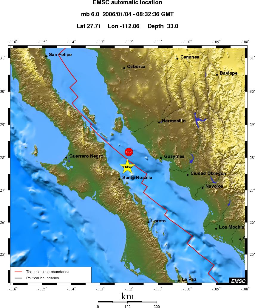Schweres Erdbeben im Norden Mexikos Noch keine Meldungen über größere Schäden (Mittwoch, 04.01.06) Am Mittwoch hat gegen 09:32 Uhr MEZ (= 01:32 Uhr Ortszeit) ein schweres Erdbeben den Norden Mexikos erschüttert. Das Beben erreichte nach Angaben des amerikanischen Erdbebendienstes die Stärke 6,7. Das Epizentrum lag unter dem Golf von Kalifornien, etwa 90 Kilometer nordöstlich der Stadt Santa Rosalía (ca. 10.000 Einwohner) auf der mexikanischen Halbinsel Baja California. Der Erdbebenherd befand sich etwa 10 Kilometer unter der Oberfläche. Über größere Schäden ist nichts bekannt. ![]() © by USGS - Die Karte des amerikanischen Erdbebendienstes zeigt die Lage des Epizentrums nordöstlich von Santa Rosalía. Der Erdstoß war in der gesamten Region im Nordwesten Mexikos zu spüren. Dennoch gab es nach den vorliegenden Berichten nur geringe Schäden und niemand wurde verletzt. Dem Hauptbeben gingen mehrere leichte bis mittelstarke Vorbeben voraus. Davon erreichte eines mehr als sieben Stunden zuvor die Stärke 5,0. Es folgten noch einige Nachbeben, die allerdings auf dem Festland kaum spürbar waren. ![]() © by USGS - Diese Karte des amerikanischen Erdbebendienstes zeigt ebenfalls die Lage des Epizentrums unter dem Golf von Kalifornien. ![]() © by EMSC - Zum Vergrößern bitte klicken. Die Karte des EMSC zeigt die Berechungen zum Epizentrum der verschiedenen Erdbebendienste. | |