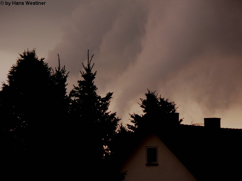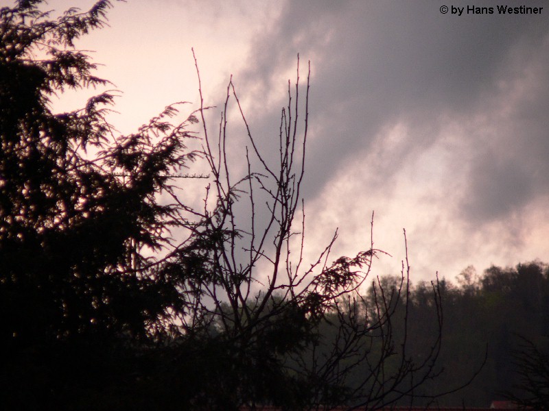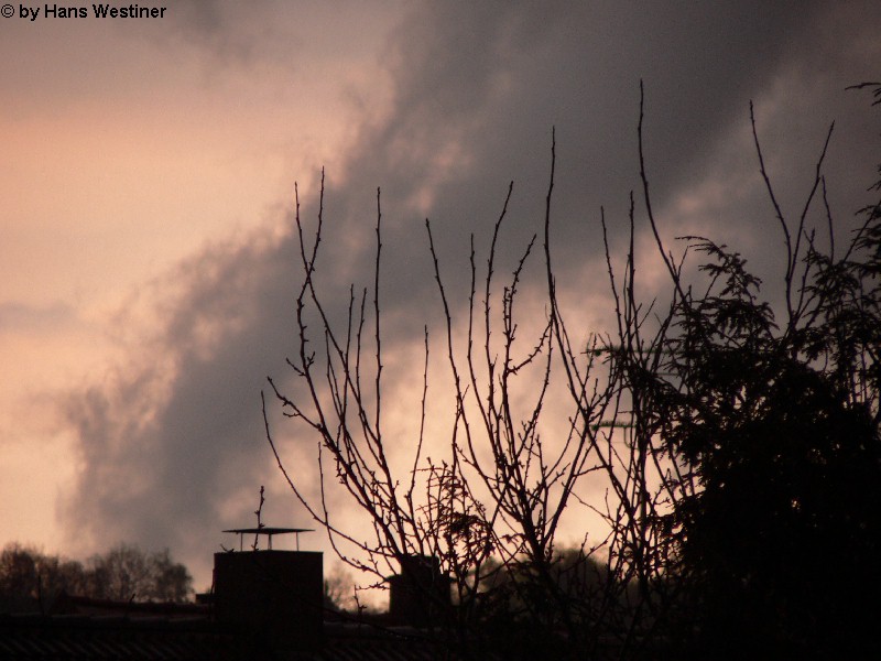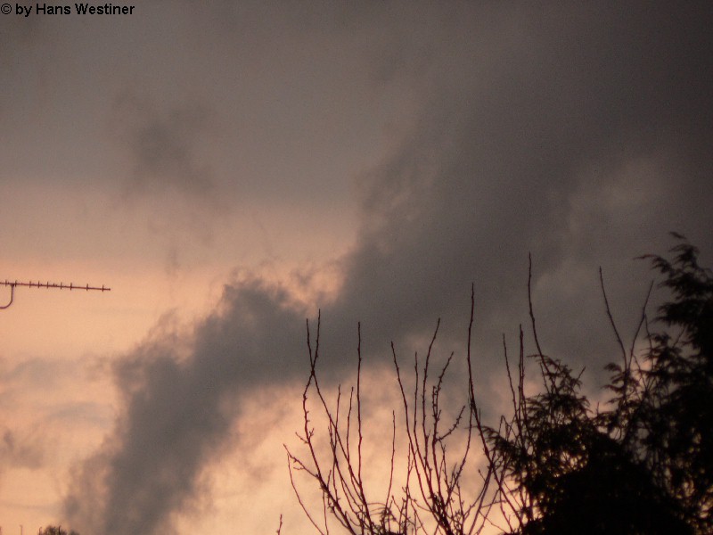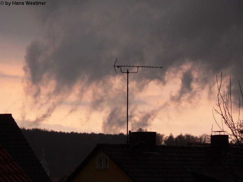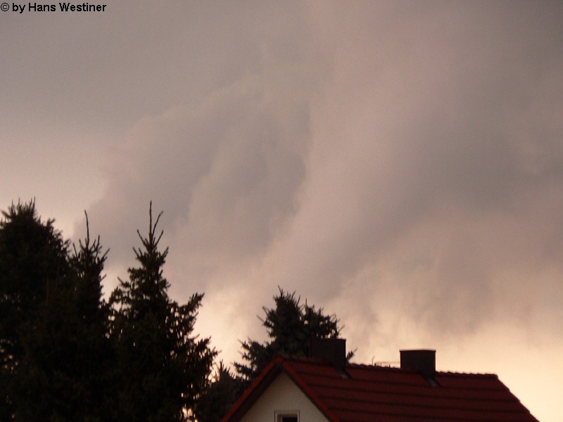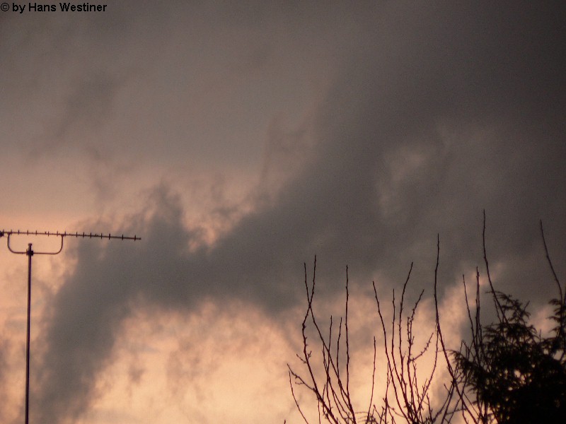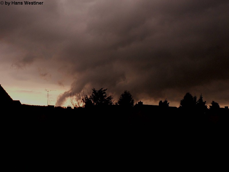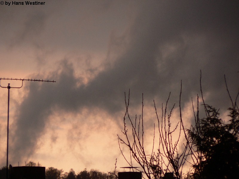 Hans Westiner macht diese Aufnahmen: "Heute, den 26.04.06 um ca. 18:40 Uhr habe ich einige Fotos von verdächtigen Wolkenformationen im Vorfeld eines Gewitters gemacht. Ich weiß nicht, ob auch Rotation dabei war, da ich dies aus der Entfernung nicht erkennen konnte. Die meisten Fotos sind herangezoomt. Das Gewitter kam aus südwestlicher Richtung auf meinen Wohnort Schwandorf (Bayern) zu. Die Fotos sind von meinem Balkon in östliche Richtung (Schwandorf-Weinberg) gemacht. Die fotografierten Wolken bewegten sich sehr schnell, obwohl die Wolken über unserem Haus fast auf der Stelle stehen blieben. Nach ca. 2 Minuten löste sich die fotografierte Wolkenformation auf." Links sehen Sie jeweils die Originalfotos (etwas überbelichtet), rechts dazu die leicht verdunkelten Aufnahmen. Zum Vergrößern bitte jeweils die Bilder anklicken.