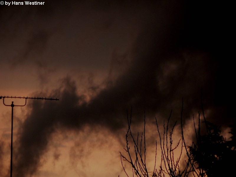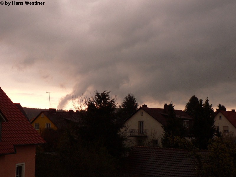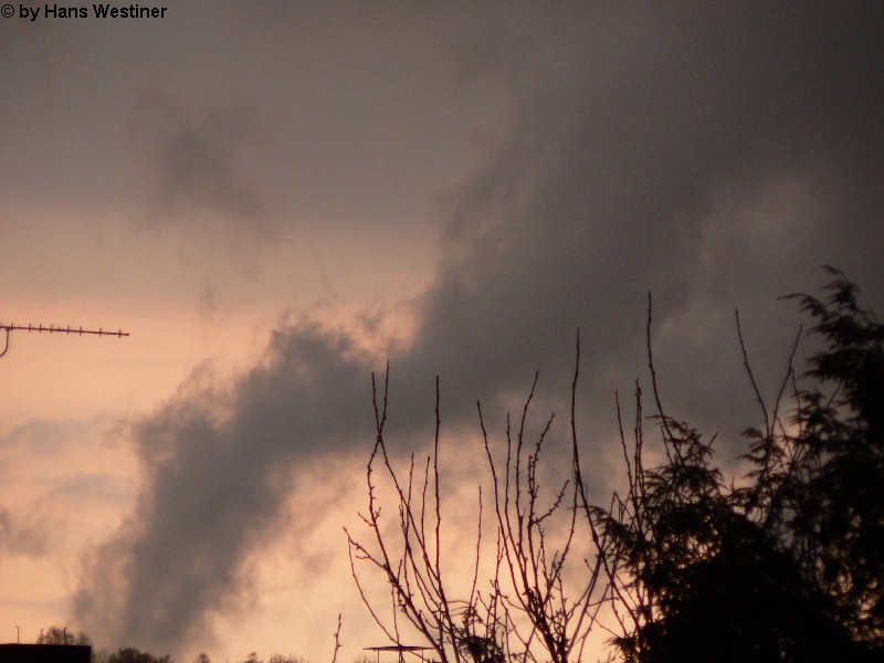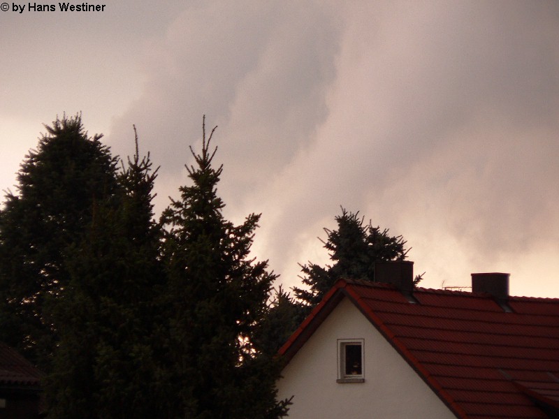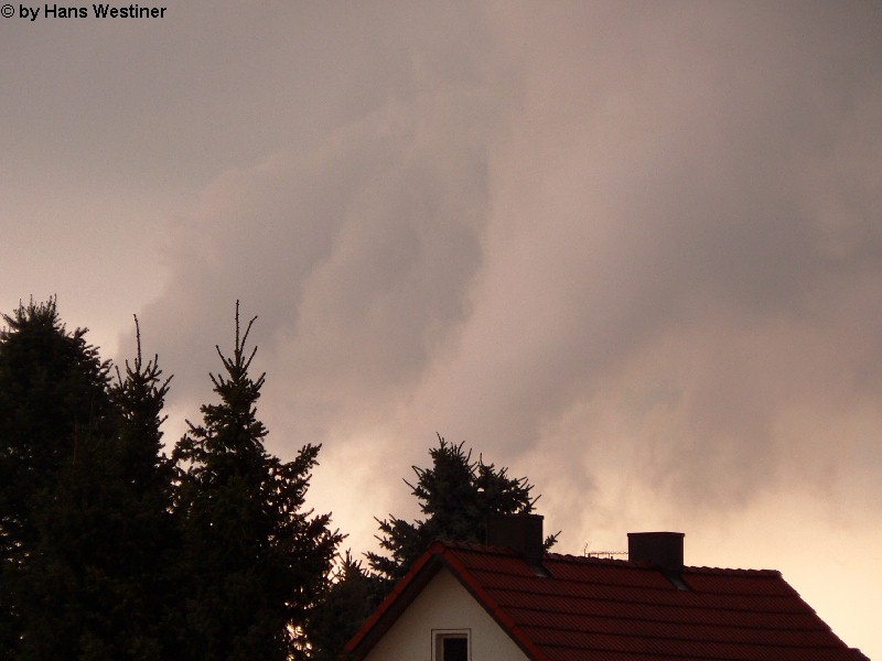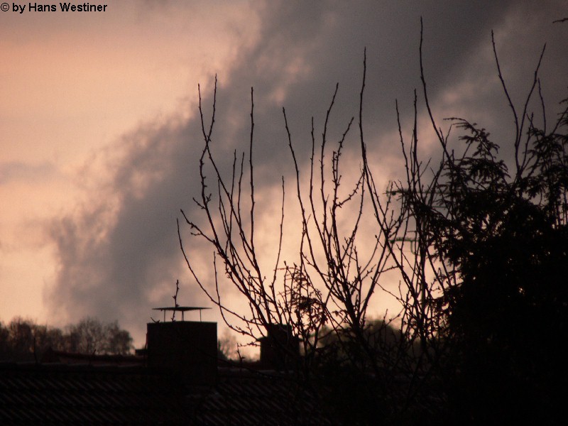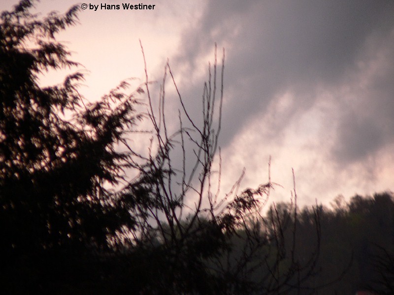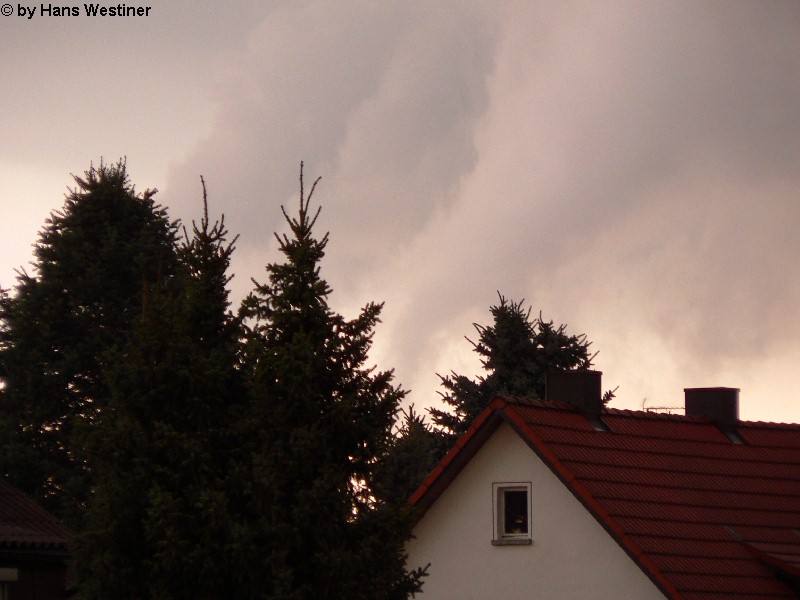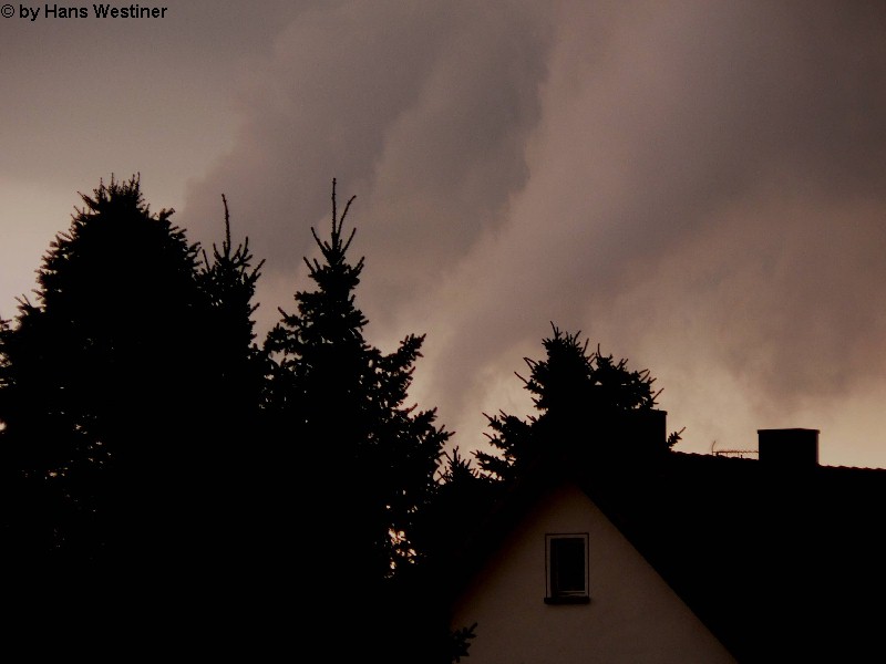 Hans Westiner macht diese Aufnahmen: "Heute, den 26.04.06 um ca. 18:40 Uhr habe ich einige Fotos von verdächtigen Wolkenformationen im Vorfeld eines Gewitters gemacht. Ich weiß nicht, ob auch Rotation dabei war, da ich dies aus der Entfernung nicht erkennen konnte. Die meisten Fotos sind herangezoomt. Das Gewitter kam aus südwestlicher Richtung auf meinen Wohnort Schwandorf (Bayern) zu. Die Fotos sind von meinem Balkon in östliche Richtung (Schwandorf-Weinberg) gemacht. Die fotografierten Wolken bewegten sich sehr schnell, obwohl die Wolken über unserem Haus fast auf der Stelle stehen blieben. Nach ca. 2 Minuten löste sich die fotografierte Wolkenformation auf." Links sehen Sie jeweils die Originalfotos (etwas überbelichtet), rechts dazu die leicht verdunkelten Aufnahmen. Zum Vergrößern bitte jeweils die Bilder anklicken.