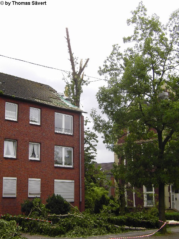 | Der Tornado zog weiter nordostwärts über die Autobahn A 42 hinweg in den Stadtteil Osterfeld, wo erneut erhebliche Schäden entstanden. Baumteile und Gegenstände wurden hier erheblich verfrachtet. Die Schneise setzt sich dann durch das gesamte Stadtgebiet von Bottrop fort bis nach Gladbeck.