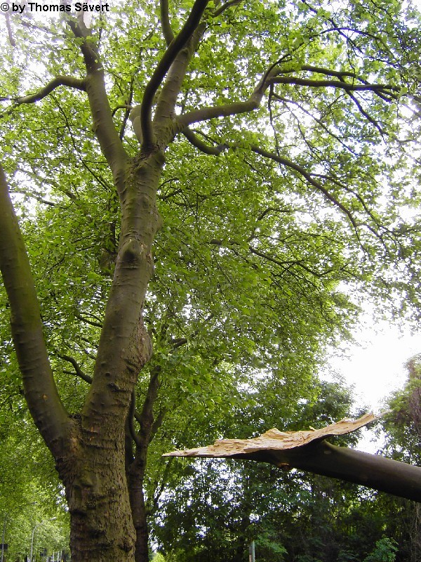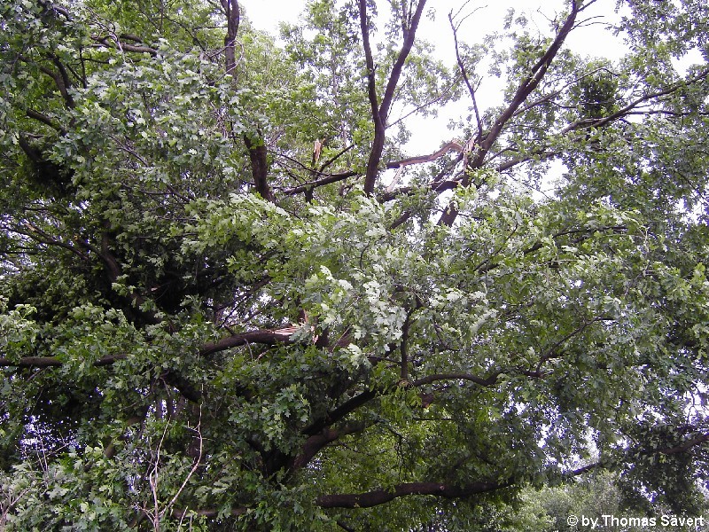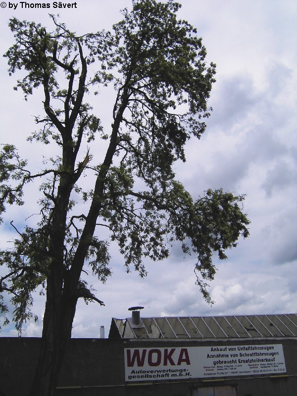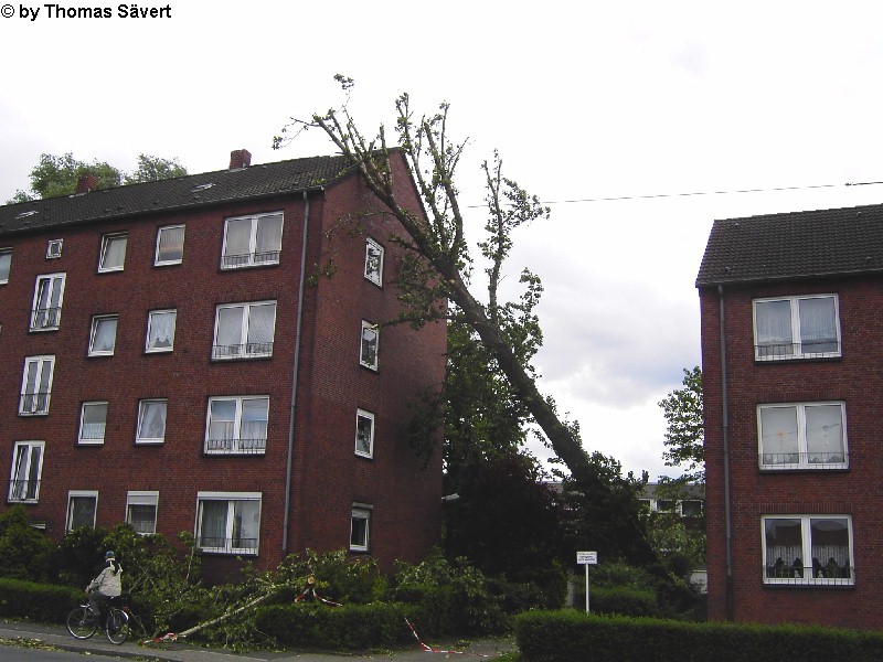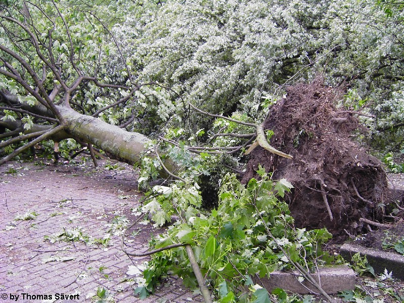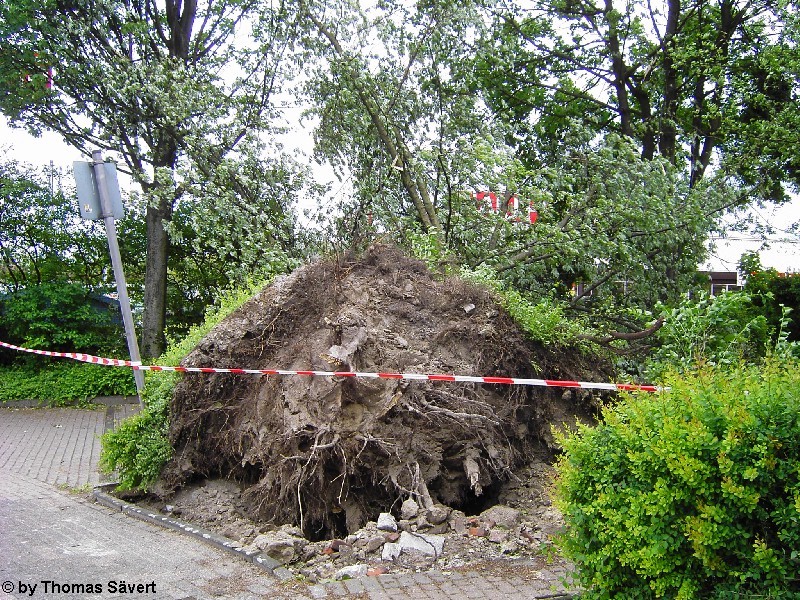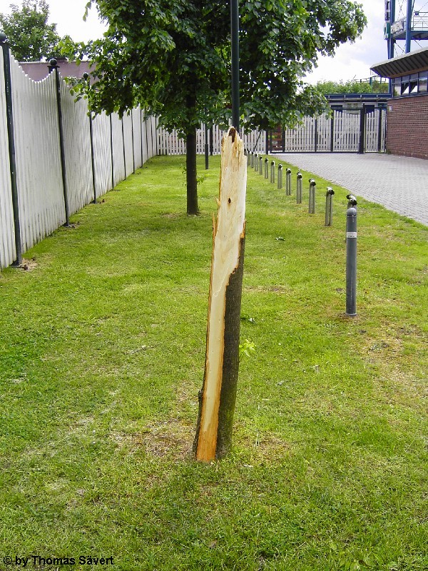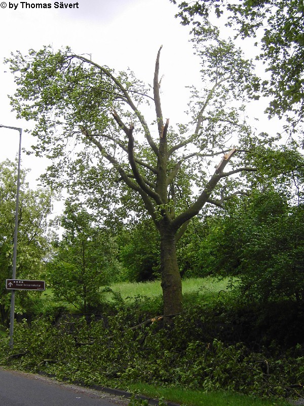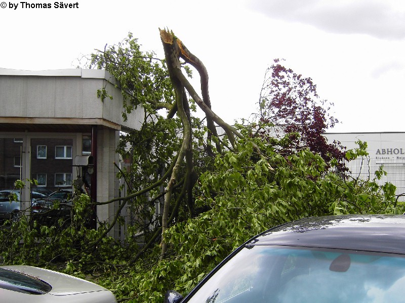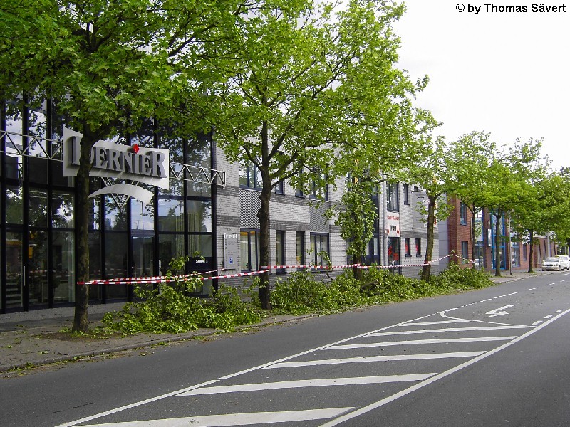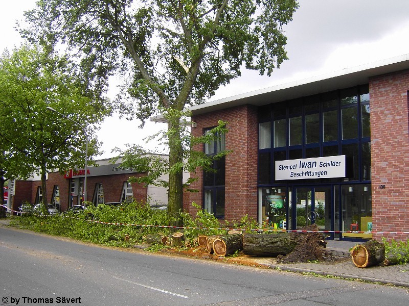 Die Baumkrone im Bild oben rechts stammt nicht von einem Baum direkt bei diesem Autohändler, sondern wurde von einem weiter entfernten Baum abgebrochen und stürzte hier wieder senkrecht zu Boden.