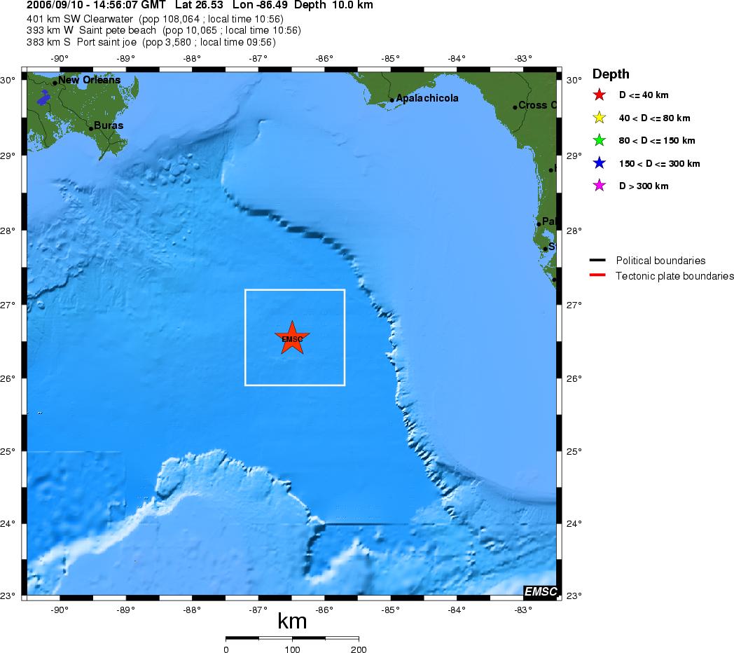 Schweres Erdbeben im Golf von Mexiko Keine Meldungen über Schäden oder Flutwelle (Sonntag, 10.09.06) Am Sonntag hat gegen 16:56 Uhr MESZ (= 08:56 Uhr Ortszeit) ein schweres Erdbeben den Meeresboden im östlichen Golf von Mexiko erschüttert. Das unterseeische Beben erreichte nach Angaben des amerikanischen Erdbebendienstes die Stärke 6,0. Das Epizentrum lag etwa 400 Kilometer vor der Westküste Floridas und etwa 530 Kilometer südöstlich der Stadt New Orleans. Der Erdbebenherd befand sich etwa 10 Kilometer unter der Oberfläche. Das Beben war in weiten Teilen der südöstlichen USA zu spüren, Schäden an Land gab es aber nicht und auch eine Flutwelle wurde nicht gemeldet. Über Auswirkungen auf die Ölproduktion im Golf von Mexiko ist nichts bekannt. ![]() © by USGS - Die Karte des amerikanischen Erdbebendienstes zeigt die Lage des Epizentrums im Golf von Mexiko. Zu spüren war das Beben in weiten Bereichen im Südosten der USA. Allein aus Florida und Georgia gingen in der ersten Stunde nach dem Beben hunderte Anrufe besorgter Bürger bei den Behörden ein. Weitere Meldungen liegen aus Alabama, Louisiana and Mississippi bis etwa 800 Kilometer vom Epizentrum entfernt vor. Einzelne Berichte gibt es sogar aus South und North Carolina an der Ostküste der USA. ![]() © by USGS - Diese Karte des amerikanischen Erdbebendienstes zeigt, wo das Beben im Südosten der USA zu spüren war. Der Erdstoß ereignete sich weit entfernt von allen Plattengrenzen. Solche Beben mitten innerhalb einer Erdplatte sind viel setener als an den Plattengrenzen. Das aktuelle Beben ist sehr ungewöhnlich. In den vergangenen 30 Jahren wurden unter dem östlichen Golf von Mexiko mehr als ein dutzend Erdbeben registriert, aber sie waren fast durchweg schwach. Das bisher stärkste Beben in dieser Region ereignete sich erst vor wenigen Monaten: Am 10. Februar 2006 erreichte ein Erdbeben vor der Küste Louisianas die Stärke 5,2. ![]() © by USGS - Diese Karte des amerikanischen Erdbebendienstes zeigt ebenfalls die Lage des Epizentrums westlich der Halbinsel Florida. ![]() © by EMSC - Zum Vergrößern bitte klicken. Die Karte des EMSC zeigt die Berechungen zum Epizentrum der verschiedenen Erdbebendienste. | |