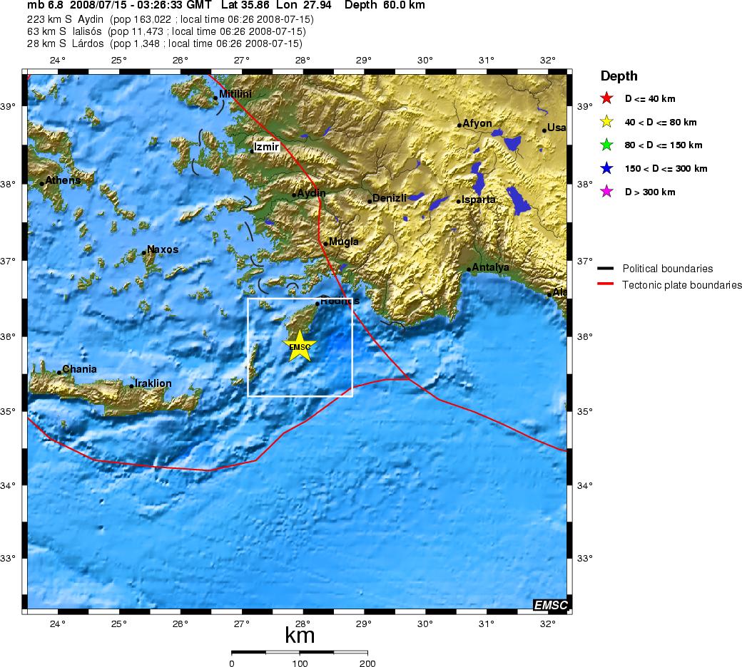 Schweres Erdbeben vor Rhodos Keine größeren Schäden oder gefährliche Flutwelle gemeldet (Dienstag, 15.07.08) Am Dienstag hat gegen 05:26 Uhr MESZ (= 06:26 Uhr Ortszeit) ein schweres Erdbeben die griechische Insel Rhodos und den Südwesten der Türkei erschüttert. Das unterseeische Beben erreichte nach vorläufigen Angaben des amerikanischen Erdbebendienstes die Stärke 6,4. Das Epizentrum lag bei der Südspitze der Insel Rhodos und etwa 145 Kilometer südsüdwestlich der türkischen Stadt Mugla. Der Erdbebenherd befand sich 60 bis 70 Kilometer unter der Oberfläche. Das Beben war in der gesamten Region von Rhodos bis nach Kreta und auf den Ägäisinseln sowie im Südwesten der Türkei zu spüren. Auf der Insel Rhodos flohen zahlreiche Menschen in Panik aus den Häusern. Bei einem Sturz kam eine Frau ums Leben. Meldungen über größere Schäden oder eine gefährliche Flutwelle liegen nicht vor. ![]() © by USGS - Die Karte des amerikanischen Erdbebendienstes zeigt die Lage des Epizentrums bei Rhodos. ![]() © by USGS - Diese Karte des amerikanischen Erdbebendienstes zeigt ebenfalls die Lage des Epizentrums vor der türkischen Südwestküste. ![]() © by EMSC - Zum Vergrößern bitte klicken. Die Karte des EMSC zeigt die Berechnungen zum Epizentrum des European-Mediterranean Seismological Centre. ![]() © by USGS - Die Karte des amerikanischen Erdbebendienstes zeigt die Lage des Epizentrums im Osten Griechenlands. | |