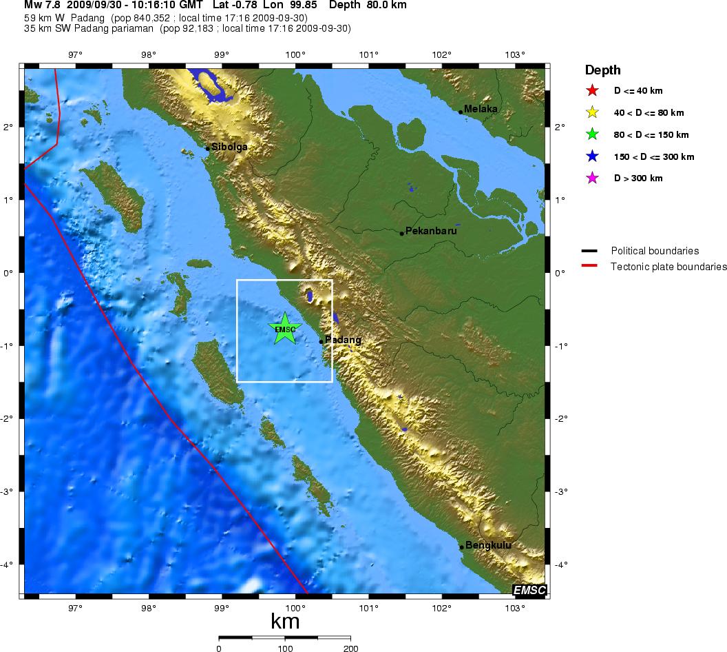Sehr schweres Erdbeben vor Sumatra Weit mehr als 1.000 Tote in Padang gemeldet (Mittwoch, 30.09.09) Am Mittwoch hat gegen 12:16 Uhr MESZ (= 17:16 Uhr Ortszeit) ein sehr schweres Erdbeben den Meeresboden vor der Westküste Sumatras erschüttert. Das unterseeische Beben erreichte nach vorläufigen Angaben des amerikanischen Erdbebendienstes die Stärke 7,6. Das Epizentrum lag etwa 50 Kilometer westnordwestlich von Padang (ca. 900.000 Einwohner) und damit etwa 960 Kilometer nordwestlich der indonesischen Hauptstadt Jakarta. Der Erdbebenherd befand sich 80 bis 85 Kilometer unter der Oberfläche. In Padang stürzten viele Gebäude ein und weit mehr als 1000 Menschen kamen ums Leben. An der Küste wurde nur eine kleine Flutwelle registriert, eine Tsunamiwanung konnte bald wieder aufgehoben werden. In der Nacht zum Donnerstag folgte ein weiteres Erdbeben der Stärke 6,6. ![]() © by USGS - Die Karte des amerikanischen Erdbebendienstes zeigt die Lage des Epizentrums vor Padang. ![]() © by USGS - Diese Karte des amerikanischen Erdbebendienstes zeigt ebenfalls die Lage des Epizentrums vor Sumatra. ![]() © by EMSC - Zum Vergrößern bitte klicken. Die Karte des EMSC zeigt die Berechnungen zum Epizentrum des European-Mediterranean Seismological Centre. ![]() © by USGS - Die Karte des amerikanischen Erdbebendienstes zeigt die Lage des Epizentrums in Indonesien. | |