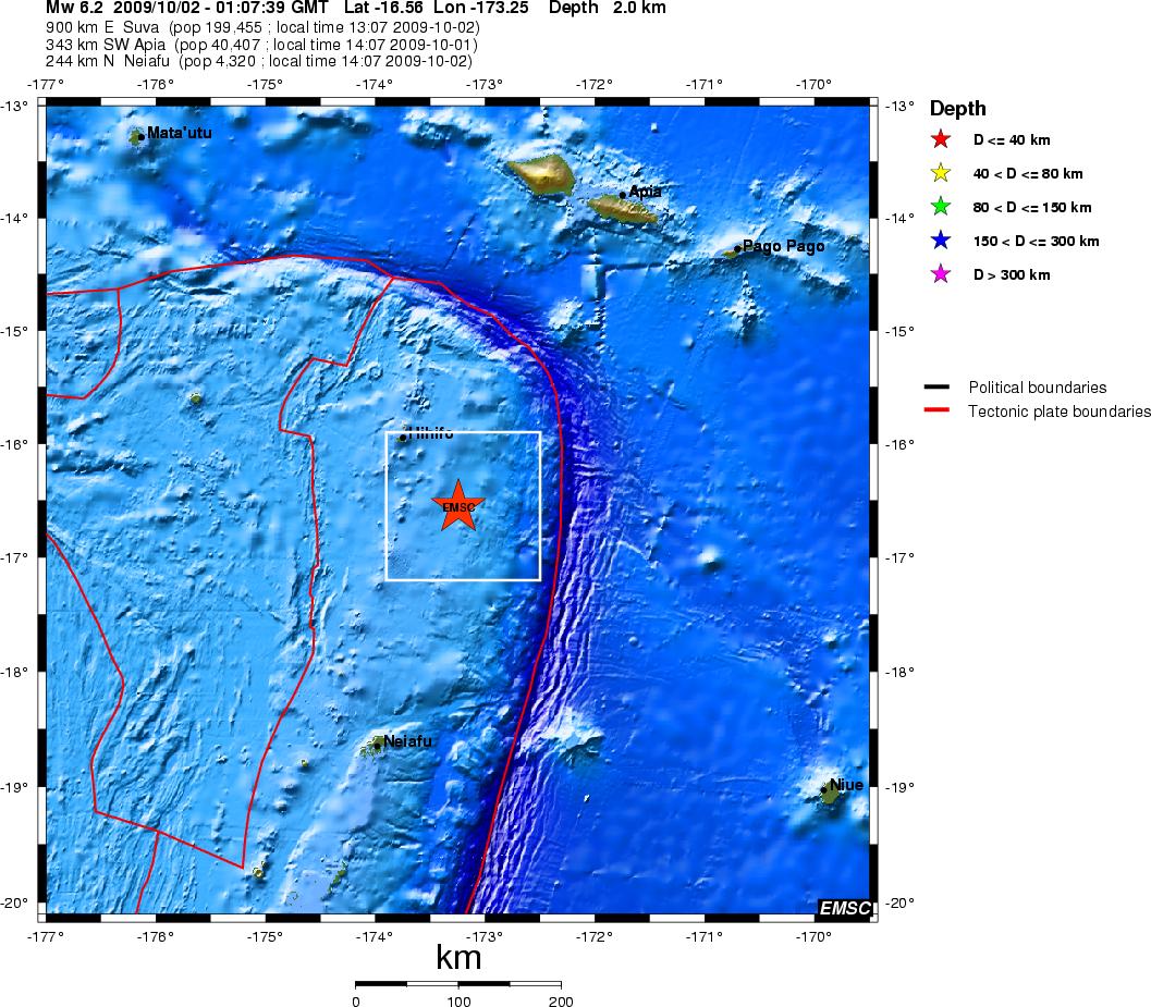 Weiteres schweres Erdbeben bei Tonga Keine neuen Schäden oder gefährliche Flutwelle gemeldet (Freitag, 02.10.09) Am Freitag hat gegen 03:07 Uhr MESZ (= 14:07 Uhr Ortszeit) erneut ein schweres Erdbeben den Meeresboden bei Tonga und Samoa im Südpazifik erschüttert. Das unterseeische Beben erreichte nach vorläufigen Angaben des amerikanischen Erdbebendienstes die Stärke 6,1. Das Epizentrum lag etwa 85 Kilometer südöstlich von Hihifo (zu Tonga) und etwa 345 Kilometer südwestlich von Apia (ca. 40.000 Einwohner), Samoa. Der Erdbebenherd befand sich rund 10 Kilometer unter der Oberfläche. Meldungen über neue Schäden oder eine gefährliche Flutwelle liegen nicht vor. Drei Tage zuvor waren bei einem Erdstoß der Stärke 8,0 und nachfolgenden Flutwellen auf einigen Inseln von Samoa und Tonga zahlreiche Menschen ums Leben gekommen. ![]() © by USGS - Die Karte des amerikanischen Erdbebendienstes zeigt die Lage des Epizentrums südöstlich von Hihifo. ![]() © by USGS - Diese Karte des amerikanischen Erdbebendienstes zeigt ebenfalls die Lage des Epizentrums bei Tonga und Samoa. ![]() © by EMSC - Zum Vergrößern bitte klicken. Die Karte des EMSC zeigt die Berechnungen zum Epizentrum des European-Mediterranean Seismological Centre. | |