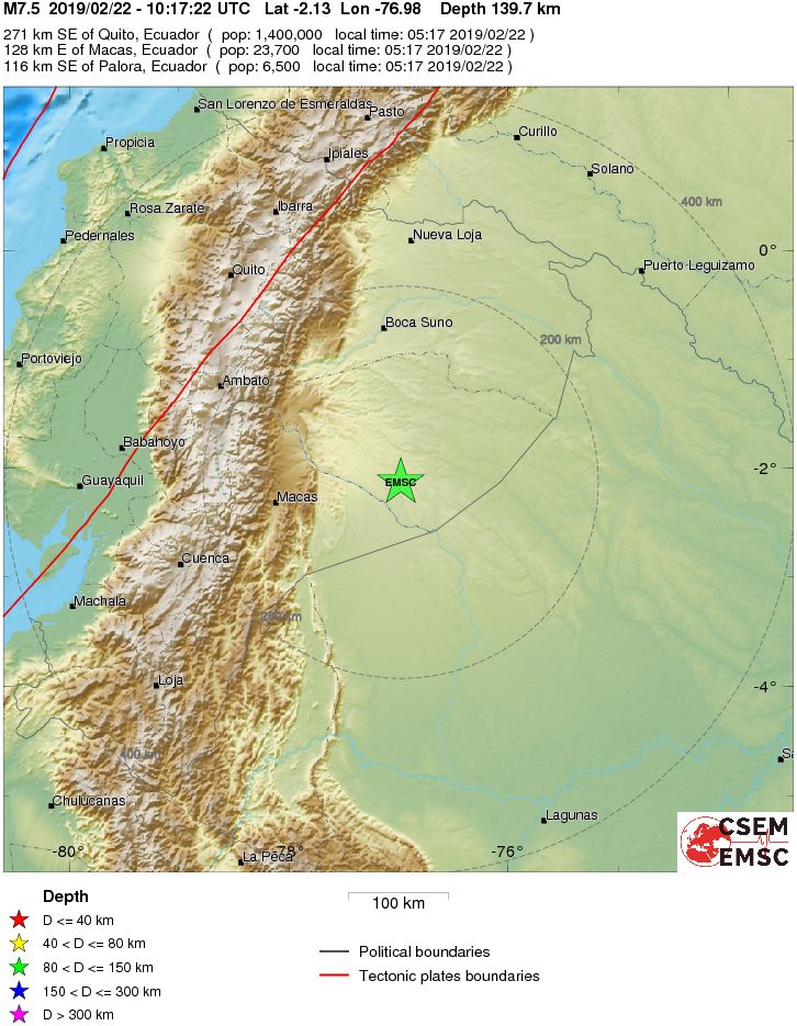 Schweres Erdbeben in Ecuador Einige Schäden, aber keine Opfer gemeldet (Freitag, 22.02.19) Am Freitag hat gegen 11:17 Uhr MEZ (05:17 Uhr Ortszeit) ein schweres Erdbeben Teile Südamerikas erschüttert. Das Beben erreichte nach vorläufigen Angaben des amerikanischen Erdbebendienstes die Stärke 7,5. Das Epizentrum lag im Landesinnern Ecuadors, nahe der Grenze zu Peru, etwa 120 Kilometer östlich von Macas (ca. 24.000 Einwohner). Der Erdbebenherd befand sich 130 bis 140 Kilometer unter der Oberfläche. Das Beben war in weitem Umkreis zu spüren. Einige Schäden wurden trotz der großen Herdtiefe gemeldet. ![]() © by USGS - Die Karte des amerikanischen Erdbebendienstes zeigt die Lage des Epizentrums in Ecuador. ![]() © by EMSC - Zum Vergrößern bitte klicken. Die Karte des EMSC zeigt die Berechnungen zum Epizentrum des European-Mediterranean Seismological Centre. ![]() © by USGS - Die Karte des amerikanischen Erdbebendienstes zeigt die Lage des Epizentrums in der Region und die Spürbarkeit des Erdstoßes. | |