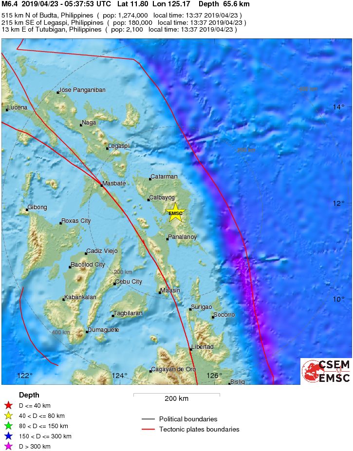 Weiteres schweres Erdbeben auf den Philippinen Dutzende Tote und erhebliche Schäden gemeldet (Dienstag, 23.04.19) Am Dienstag hat gegen 07:38 Uhr MESZ (13:38 Uhr Ortszeit) ein weiteres schweres Erdbeben Teile der Philippinen erschüttert. Das Beben erreichte nach vorläufigen Angaben des amerikanischen Erdbebendienstes die Stärke 6,3. Das Epizentrum lag im Landesinnern der Insel Samar im Osten der Inselgruppe, etwa 35 Kilometer östlich der Stadt Catbalogan (ca. 68.000 Einwohner) und etwa 220 Kilometer nordöstlich der Stadt Cebu City (ca. 800.000 Einwohner). Der Erdbebenherd befand sich 50 bis 60 Kilometer unter der Oberfläche. Nach den vorliegenden Meldungen gab es mehrere Verletzte und einige Schäden. Erst einen Tag zuvor erschütterte ein Beben der Stärke 6,1 den Großraum Manila und mehrere Menschen kamen hier ums Leben. Im Jahre 1990 kamen bei einem Erdbeben der Stärke 7,6 etwa 2.400 Menschen auf den Philippinen ums Leben. ![]() © by USGS - Die Karte des amerikanischen Erdbebendienstes zeigt die Lage des Epizentrums auf den Philippinen. ![]() © by EMSC - Zum Vergrößern bitte klicken. Die Karte des EMSC zeigt die Berechnungen zum Epizentrum des European-Mediterranean Seismological Centre. ![]() © by USGS - Die Karte des amerikanischen Erdbebendienstes zeigt die Lage des Epizentrums in der Region und die Spürbarkeit des Erdstoßes. | |