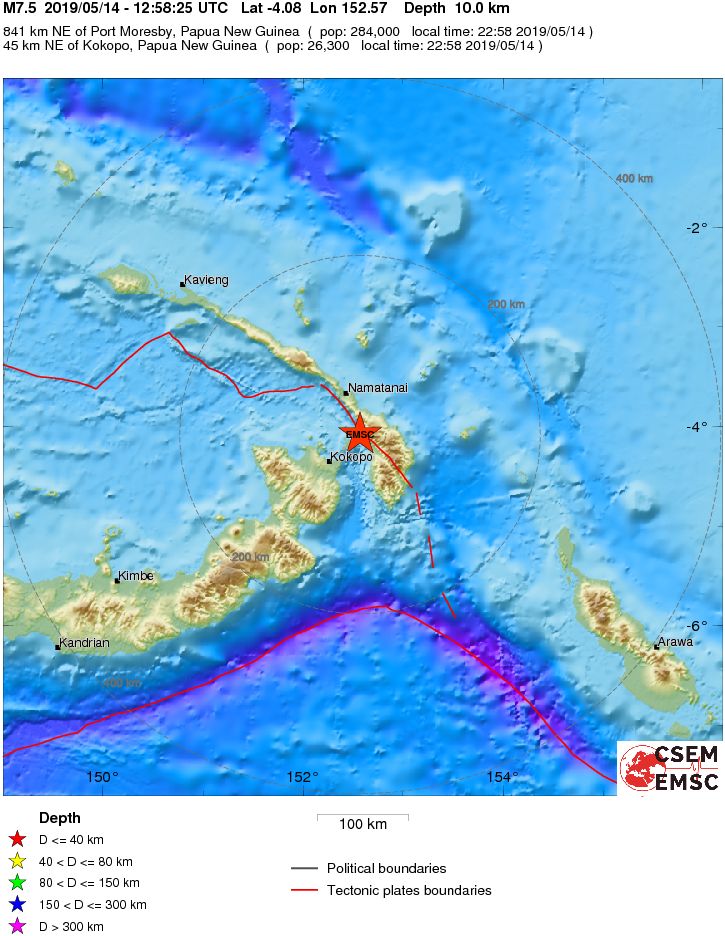 Sehr schweres Erdbeben bei Neuguinea Tsunamiwarnung für Teile Neuguineas (Dienstag, 14.05.19) Am Dienstag hat gegen 14:58 Uhr MESZ (22:58 Uhr Ortszeit) ein sehr schweres Erdbeben den Meeresboden bei Neuguinea erschüttert. Das unterseeische Beben erreichte nach vorläufigen Angaben des amerikanischen Erdbebendienstes die Stärke 7,5. Das Epizentrum lag zwischen den zu Neuguinea gehörenden Inseln Neubritannien und Neuirland, etwa 45 Kilometer nordöstlich der Stadt Kokopo (ca. 26.000 Einwohner) auf der Insel Neubritannien und etwa 840 Kilometer nordöstlich der Hauptstadt Port Moresby. Der Erdbebenherd befand sich rund 10 Kilometer unter der Oberfläche. Für Teile Neuguineas wurde eine Tsunamiwarnung ausgegeben, die aber nach 1,5 Stunden aufgehoben wurde. Auf den umliegenden Inseln gab es meist leichtere Schäden, über Opfer ist nichts bekannt. ![]() © by USGS - Die Karte des amerikanischen Erdbebendienstes zeigt die Lage des Epizentrums bei Neuguinea. ![]() © by EMSC - Zum Vergrößern bitte klicken. Die Karte des EMSC zeigt die Berechnungen zum Epizentrum des European-Mediterranean Seismological Centre. ![]() © by USGS - Die Karte des amerikanischen Erdbebendienstes zeigt die Lage des Epizentrums in der Region und die Spürbarkeit des Erdstoßes. | |