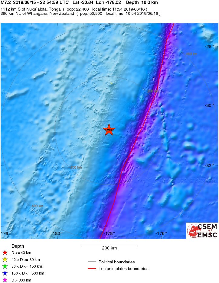 Schweres Erdbeben bei Neuseeland Keine Schäden und nur kleiner Tsunami gemeldet (Sonntag, 16.06.19) Am Sonntag hat gegen 00:55 Uhr MESZ (= 10:55 Uhr Ortszeit am Samstagvormittag) ein schweres Erdbeben den Meeresboden nordöstlich von Neuseeland erschüttert. Das unterseeische Beben erreichte nach vorläufigen Angaben des amerikanischen Erdbebendienstes die Stärke 7,2. Das Epizentrum lag etwa 105 Kilometer nordöstlich der Felseninsel L'Esperance Rock in den Kermadec Islands und etwa 890 Kilometer nordöstlich der Stadt Whangarei auf der neuseeländischen Nordinsel. Der Erdbebenherd befand sich 30 bis 40 Kilometer unter der Oberfläche. Für die umliegenden Inseln wurde eine Tsunamiwarnung ausgegeben, es wurde aber nur an einzelnen Messstationen ein geringer Anstieg des Meeres registriert. Schäden wurden nicht gemeldet. In der Region nordöstlich von Neuseeland treten häufig schwere Erdbeben auf, zuletzt am 06. März 2019 mit der Stärke 6,4. ![]() © by USGS - Die Karte des amerikanischen Erdbebendienstes zeigt die Lage des Epizentrums nordöstlich von Neuseeland. Dem Hauptbeben folgten zahlreiche Nachbeben, darunter ein Beben der Stärke 6,3 gut sechs Stunden nach dem stärksten Beben und ein Beben der Stärke 6,0 einen Tag später. ![]() © by EMSC - Zum Vergrößern bitte klicken. Die Karte des EMSC zeigt die Berechnungen zum Epizentrum des European-Mediterranean Seismological Centre. ![]() © by USGS - Die Karte des amerikanischen Erdbebendienstes zeigt die Lage des Epizentrums in der Region und die Spürbarkeit des Erdstoßes. | |
