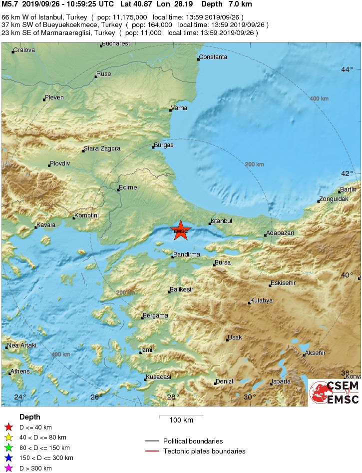 Starkes Erdbeben im Westen der Türkei Einige Schäden westlich von Istanbul gemeldet (Donnerstag, 26.09.19) Am Donnerstag hat gegen 12:59 Uhr MESZ (= 13:59 Uhr Ortszeit) ein starkes Erdbeben den Nordwesten der Türkei erschüttert. Das Beben erreichte nach vorläufigen Angaben des amerikanischen Erdbebendienstes die Stärke 5,7. Das Epizentrum lag unter dem Marmarameer, etwa 20 Kilometer südsüdwestlich der Stadt Silivri (ca. 53.000 Einwohner) und etwa 65 Kilometer westlich der Metropole Istanbul. Der Erdbebenherd befand sich 7 bis 10 Kilometer unter der Oberfläche. Aus den Orten rund um das Marmarameer wurden einige Schäden gemeldet. ![]() © by USGS - Die Karte des amerikanischen Erdbebendienstes zeigt die Lage des Epizentrums im Westen der Türkei. ![]() © by EMSC - Zum Vergrößern bitte klicken. Die Karte des EMSC zeigt die Berechnungen zum Epizentrum des European-Mediterranean Seismological Centre. ![]() © by USGS - Die Karte des amerikanischen Erdbebendienstes zeigt die Lage des Epizentrums in der Region und die Spürbarkeit des Erdstoßes. | |