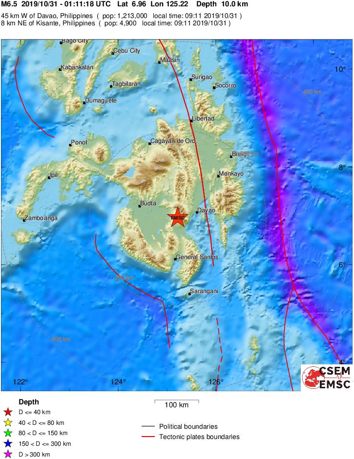 Weiteres schweres Erdbeben auf den Philippinen Nach ersten Berichten erneut erhebliche gemeldet (Donnerstag, 31.10.19) Am Donnerstag hat gegen 02:11 Uhr MEZ (= 09:11 Uhr Ortszeit) ein weiteres schweres Erdbeben die Insel Mindanao im Süden der Philippinen erschüttert. Das Beben erreichte nach vorläufigen Angaben des amerikanischen Erdbebendienstes die Stärke 6,5. Das Epizentrum lag nahe der Stadt Kidapawan (ca. 80.000 Einwohner) und etwa 55 Kilometer westsüdwestlich der Stadt Davao (ca. 1,2 Mio. Einwohner). Der Erdbebenherd befand sich rund 10 Kilometer unter der Oberfläche. Nach ersten Meldungen gab es erneut größere Schäden. Zuletzt hatten zwei schwere Erdstöße der Stärke 6,6 am 29. Oktober und der Stärke 6,4 am 16. Oktober die Insel Mindanao erschüttert und große Schäden angerichtet. ![]() © by USGS - Die Karte des amerikanischen Erdbebendienstes zeigt die Lage des Epizentrums auf den Philippinen. ![]() © by EMSC - Zum Vergrößern bitte klicken. Die Karte des EMSC zeigt die Berechnungen zum Epizentrum des European-Mediterranean Seismological Centre. ![]() © by USGS - Die Karte des amerikanischen Erdbebendienstes zeigt die Lage des Epizentrums in der Region und die Spürbarkeit des Erdstoßes. | |