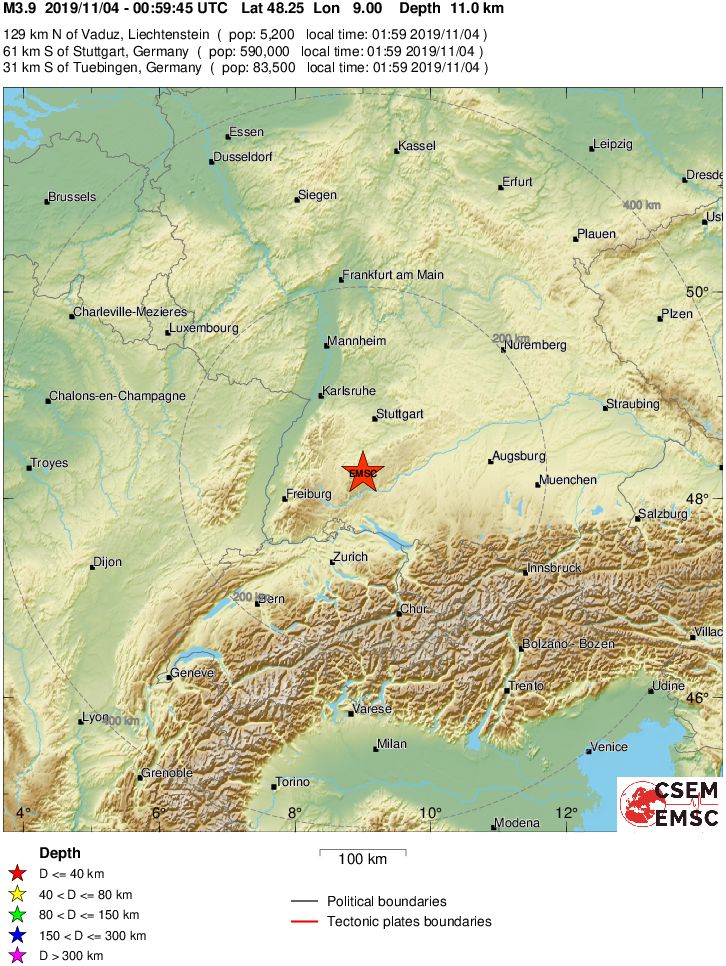 Leichtes Erdbeben auf der Schwäbischen Alb Keine größeren Schäden gemeldet (Montag, 04.11.19) In der Nacht zum Montag hat gegen 02:00 Uhr MEZ ein leichtes Erdbeben die Schwäbische Alb im Südwesten Deutschlands erschüttert. Das Beben erreichte nach unterschiedlichen Angaben der Erdbebendienste etwa die Stärke 3,9. Das Epizentrum lag bei Albstadt (ca. 47.000 Einwohner). Der Erdbebenherd befand sich 7 bis 11 Kilometer unter der Oberfläche. Nennenswerte Schäden wurden nicht gemeldet. Das Beben war in weiten Teilen des südlichen Baden-Württemberg und im Norden der Schweiz zu spüren. Die Schwäbische Alb gehört zu den Erdbebenschwerpunkten in Deutschland. Es ist das stärkste Erdbeben in Baden-Württemberg seit 15 Jahren. ![]() © by EMSC - Zum Vergrößern bitte klicken. Die Karte des EMSC zeigt die Berechnungen zum Epizentrum des European-Mediterranean Seismological Centre. ![]() © by EMSC - Zum Vergrößern bitte klicken. Die Karte des EMSC zeigt die Berechnungen zum Epizentrum des European-Mediterranean Seismological Centre. | |