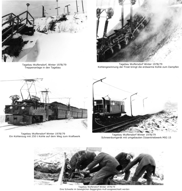 Dipl.-Bergingenieur Reiner Orlowski Harbke Am Abend des 8. Dezember 1978 fiel Regen auf den gefrorenen Boden. Sofort verwandelte sich alles in eine spiegelglatte Eisfläche. Im VEB Braunkohlenwerk Harbke stand, wie an anderen Tagen, auch der Schichtwechsel bevor. Die Mittagschicht hatte um 22°° Uhr eigentlich Schichtschluss, musste aber die Geräte und Anlagen weiter bedienen und besetzt halten, weil die Omnibusse, die mit der Belegschaft der Nachtschicht anfahren sollten, nicht pünktlich heran kamen. Der Straßenwinterdienst war nicht darauf vorbereitet und nun nicht Herr der Lage. Nur den erfahrenen und geschickten Busfahrern war es zu verdanken, dass der Schichtwechsel mit einigen Stunden Verzögerung dennoch stattfand. Die Belegschaft der Mittagsschicht konnte endlich die Fahrt in ihre Heimatorte antreten. Langsam und vorsichtig steuerten die Busfahrer zurück, doch nach ca. 4 km, in Sommersdorf, war Schluss, ein Bus stand quer und sperrte die gesamte Straßenbreite. Niemand kam vorbei und Hilfe für eine Bereinigung der Situation war nicht in Sicht. Zwei Frauen aus Sommersdorf erkannten die Situation, in der sich die übernächtigten Kollegen der Mittagsschicht nun befanden und öffneten trotz der sehr frühen Morgenstunden die Gaststätte und versorgten die Menschen mit Speisen und warmen Getränken, bis eine Weiterfahrt möglich war. Tage später fiel ca. 7 cm Schnee, der bei mäßigem Frost auch liegen blieb. Um und nach Weihnachten taute der sehr schnell weg. Die bis dahin zusätzlichen eingesetzten Hilfskräfte wurden nur noch begrenzt für die Stabilisierung der durch das Tauwetter instabil gewordenen Gleise benötigt. Bei frühlingshaftem Wetter entspannte sich die bis dahin angestrengte Lage im Tagebau. Am 31. Dezember schlug dann der Winter erneut, aber diesmal richtig zu. Früh herrschte noch offenes Wetter mit Temperaturen um +10° C. Die meisten Menschen bereiteten sich auf einen ruhigen Jahreswechsel vor. Am späten Vormittag jedoch begann die Temperatur in Harbke unvermittelt stark zu fallen. Der zuerst einsetzende Regen ging in Schnee über. Der diensthabende Mitarbeiter der Betriebsleitung begab sich vor Ort. Auch die für den Winterdienst eingeteilten Mitarbeiter im Ort Harbke wurden zu Hause in Alarmbereitschaft gesetzt. Durch die, am 28.12.1979 einsetzende, sich extrem verschlechternde Wetterlage im Norden der Republik, war das Fernsehen der DDR alarmiert und strahlte in kürzeren Abständen als sonst üblich Wetterberichte aus. Die Wetterkarten zeigten eine rasch von Norden heranziehende Unwetterfront an. Wetterwarnungen wurden für den vor der Wetterfront südlich liegenden Teil der DDR herausgegeben. Kurz vor dem Schichtwechsel gegen 13°° Uhr setzte starker Schneefall begleitet von einem heftigen Sturm ein. Die Temperatur sank binnen kurzer Zeit auf -12 bis -15° C. Die Wetterfront hatte das Werk und den Tagebau in Harbke vollständig erreicht. Die ortsansässigen Kräfte des Winterdienstes wurden vor Ort beordert und die Tagebaubelegschaft der Frühschicht veranlasst an ihren Arbeitplätzen zu bleiben. Sie wurden durch Kräfte der noch angefahrenen Mittagschicht verstärkt. Auf den Straßen herrschten bereits chaotische Zustände. Der Straßenwinterdienst hatte überhaupt keine Chance, die wichtigen Straßen freizuhalten. Ein neuralgischer Punkt war eine Anhöhe beim Ort Barneberg, über die führte die Fernverkehrstraße 245a. Schneeverwehungen bis 3 m Höhe versperrten den Weg und ließen sich im Schneesturm nicht beseitigen. Das Braunkohlenwerk Harbke war der am weitesten im Norden gelegene Tagebau der DDR und gehörte in dieser Zeit als Betriebsteil dem Werk in Röblingen/See, das wiederum dem Braunkohlenkombinat Bitterfeld unterstellt war, an. Diese beide Betriebe lagen 90 bis 100 km weiter südlich, in der Nähe der Städte Eisleben bzw. Halle/Saale. Eine Leitstelle des Kombinates überwachte die Produktion aller Betriebsteile und nahm zu Schichtende über eine Standleitung zwischen den Betrieben die Produktionsergebnisse und Lageberichte entgegen. Als der Chefdienst aus Harbke zum Ende der Frühschicht über den Wintereinbruch und über die aktivierten Einsatzkräfte Bericht erstattete, hielt man das in Röblingen und Bitterfeld für eine maßlose Übertreibung und meinte die getroffenen Maßnahmen wären stark überzogen, denn die Wetterfront war da noch nicht angekommen. In den dortigen Betrieben waren wegen der bevorstehenden Feiertage zum Jahreswechsels nur die Mindestbesetzung vor Ort. Vier Stunden später, als der Schnee, der Frost und der Sturm auch diese Region erreichte standen sie vor der gleichen Situation. Mittlerweile war es 18°° Uhr geworden und die meisten Einsatzkräfte, die man aktivieren wollte, gaben an, schon in Feierlaune, alkoholisiert und nicht mehr einsatztauglich zu sein. Der Wintereinbruch hatte aber schon zuvor die Lausitz erreicht und die Großkraftwerke konnten nicht mehr ausreichend versorgt werden. Der anfängliche Regen und der plötzliche Frost hatten die Oberleitungen der Kohlebahnen mit einem Eismantel umgeben. Das löste eine Kettenreaktion aus. Die Züge zue Versorgung der Kraftwerke bleiben stehen, Schneeverwehungen blockierten streckenweise die Fernbahnen. Wegen des hohen Wassergehaltes der Kohle fror dieselbe trotz der installierten Kohlenwagenheizung an den Entladeklappen fest. Die Wagen der Züge, die noch die Kraftwerksbunker erreichten, ließen sich nicht öffnen und wo dies dennoch gelang, rutschte die Kohle nicht aus den Selbstentladewagen in die Bunker. Zum Entladen wären Kräfte vor Ort notwendig gewesen, die ließen sich jedoch nur mit großer Verzögerung und nicht in ausreichender Zahl heranschaffen. Die Großkraftwerke waren auf eine kontinuierliche Zufuhr von Kohle angewiesen, denn die Bunkerinhalte konnten längere Förderpausen nicht überbrücken. Wegen Kohlemangel musste ziemlich schnell Kraftwerksleistung abgeboten werden. Passiert das aber unplanmäßig und plötzlich wirkt sich das auf 