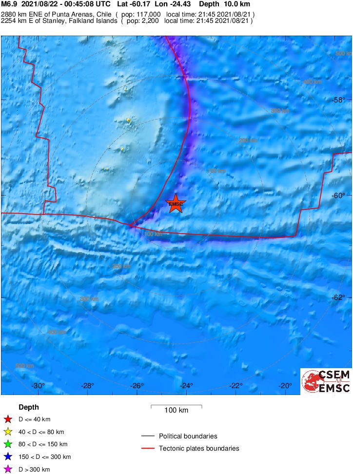 Erneut schweres Erdbeben unter dem Südatlantik Keine größeren Schäden oder Tsunami gemeldet (Sonntag, 22.08.21) Am Sonntag hat gegen 02:45 Uhr MESZ (= 22:45 Uhr Ortszeit am Samstag) erneut ein schweres Erdbeben den Meeresboden bei den South Sandwich Islands im Südatlantik erschüttert. Das unterseeische Beben erreichte nach vorläufigen Angaben des amerikanischen Erdbebendienstes die Stärke 6,8. Das Epizentrum lag bei den South Sandwich Islands, etwa 2.620 Kilometer östlich von Ushuaia in Argentinien. Der Erdbebenherd befand sich 10 bis 15 Kilometer unter der Oberfläche. Schäden oder ein Tsunami wurden nicht gemeldet. Der Meeresboden in der Region wird häufig von schweren Beben erschüttert. Es handelte sich um ein Nachbeben nach dem sehr schweren Erdstoß der Stärke 8,1 am 12. August, dem bisher stärksten im Bereich der Inselgruppe. ![]() © by USGS - Die Karte des amerikanischen Erdbebendienstes zeigt die Lage des Epizentrums unter dem Südatlantik. ![]() © by EMSC - Zum Vergrößern bitte klicken. Die Karte des EMSC zeigt die Berechnungen zum Epizentrum des European-Mediterranean Seismological Centre. ![]() © by USGS - Die Karte des amerikanischen Erdbebendienstes zeigt die Lage des Epizentrums in der Region und die Spürbarkeit des Erdstoßes. | |