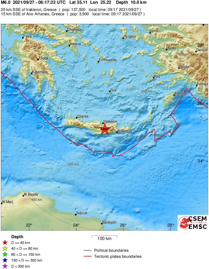 Schweres Erdbeben auf Kreta Mindestens ein Toter und einige Schäden gemeldet (Montag, 27.09.21) Am Montag hat gegen 08:17 Uhr MESZ (= 09:17 Uhr Ortszeit) ein schweres Erdbeben die griechische Insel Kreta erschüttert. Das Beben erreichte nach vorläufigen Angaben des amerikanischen Erdbebendienstes die Stärke 6,0. Das Epizentrum lag Im Inselinneren, etwa 15 Kilometer südöstlich der Stadt Heraklion (ca. 137.000 Einwohner). Der Erdbebenherd befand sich 5 bis 10 Kilometer unter der Oberfläche. Aus Heraklion und der Umgebung werden verbreitet Schäden gemeldet, einzelne Gebäude sind eingestürzt. Dabei kam mindestens ein Mensch ums Leben, zahlreiche weitere wurden verletzt. ![]() © by USGS - Die Karte des amerikanischen Erdbebendienstes zeigt die Lage des Epizentrums auf Kreta. ![]() © by EMSC - Zum Vergrößern bitte klicken. Die Karte des EMSC zeigt die Berechnungen zum Epizentrum des European-Mediterranean Seismological Centre. ![]() © by USGS - Die Karte des amerikanischen Erdbebendienstes zeigt die Lage des Epizentrums in der Region und die Spürbarkeit des Erdstoßes. | |
