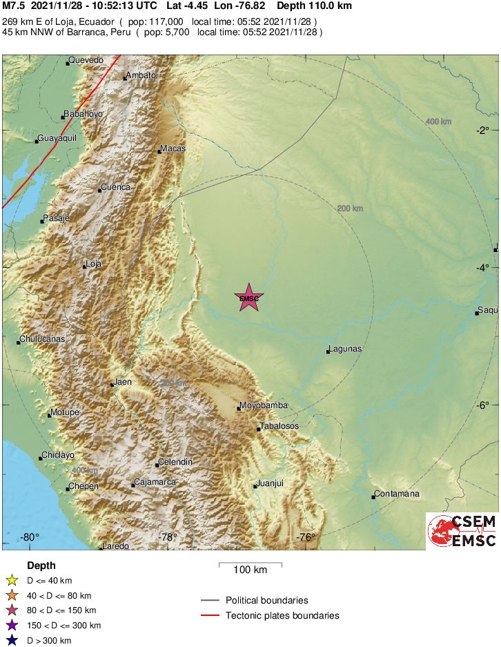 Sehr schweres Erdbeben in Peru Keine größeren Schäden gemeldet (Sonntag, 28.11.21) Am Sonntag hat gegen 11:52 Uhr MEZ (= 05:52 Uhr Ortszeit) ein sehr schweres Erdbeben den Norden Perus in Südamerika erschüttert. Das Beben erreichte nach vorläufigen Angaben des amerikanischen Erdbebendienstes die Stärke 7,5. Das Epizentrum lag etwa 45 Kilometer nordnordwestlich von Barranca (ca. 6.000 Einwohner) und etwa 270 Kilometer östlich der Stadt Loja (ca. 117.000 Einwohner) in Ecuador. Der Erdbebenherd befand sich 110 bis 120 Kilometer unter der Oberfläche. Das Beben war in weitem Umkreis deutlich zu spüren, größere Schäden wurden aber wegen der großen Herdtiefe nur vereinzelt gemeldet. ![]() © by USGS - Die Karte des amerikanischen Erdbebendienstes zeigt die Lage des Epizentrums in Peru. ![]() © by EMSC - Zum Vergrößern bitte klicken. Die Karte des EMSC zeigt die Berechnungen zum Epizentrum des European-Mediterranean Seismological Centre. ![]() © by USGS - Die Karte des amerikanischen Erdbebendienstes zeigt die Lage des Epizentrums in der Region und die Spürbarkeit des Erdstoßes. | |