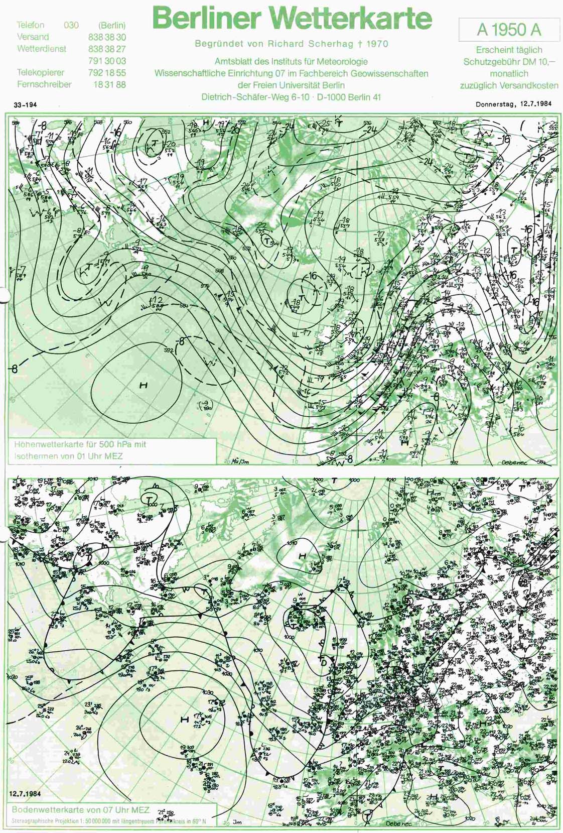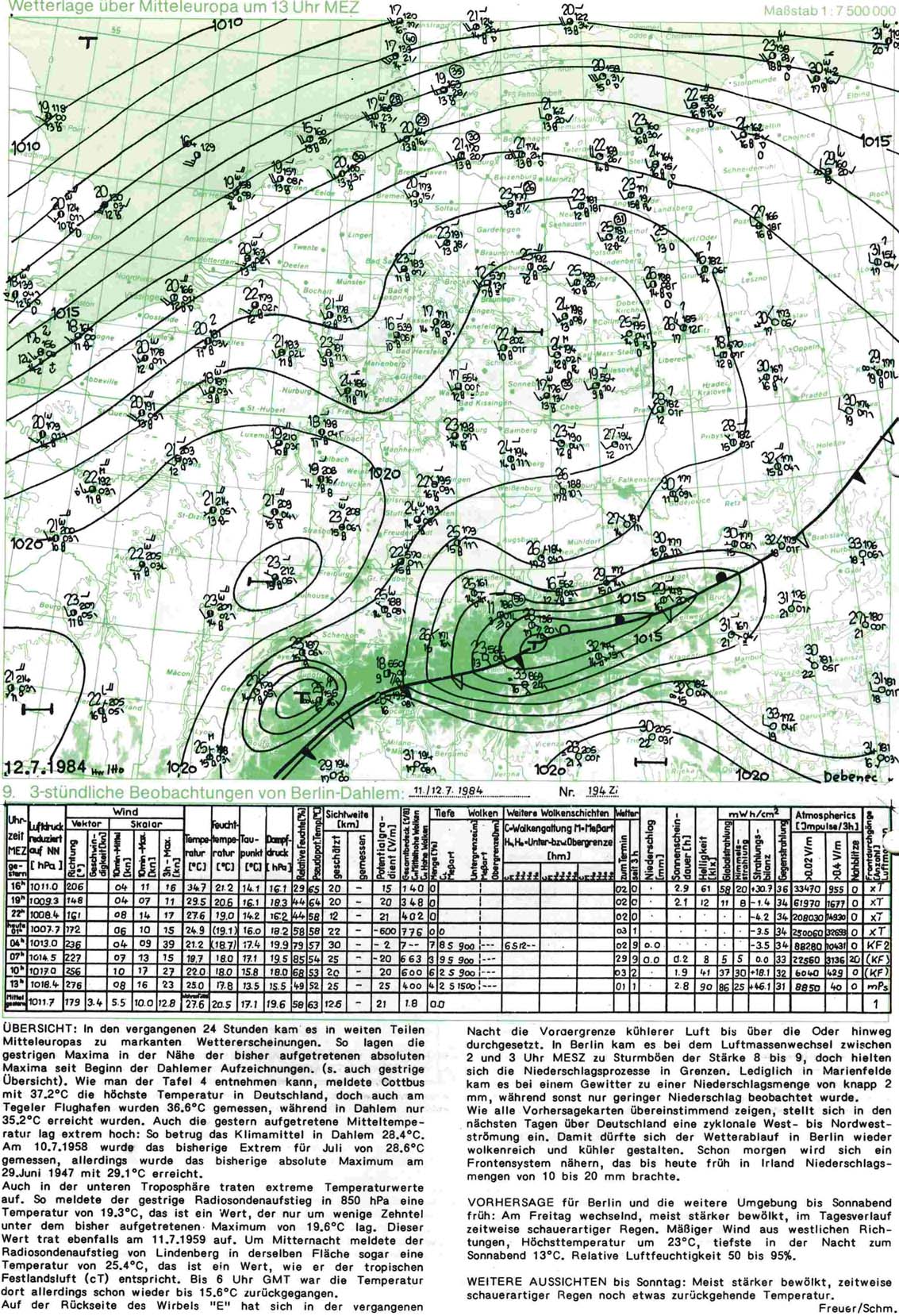 Zur Wetterlage: Mit freundlicher Genehmigung der FU Berlin hier die Mittagskarte vom 12. Juli 1984, zum Vergrößern bitte klicken (ca. 200 KB): ![]() Hier die komplette Berliner Wetterkarte von damals: Vorderseite (ca. 435 KB) und Rückseite (ca. 450 KB) Aüsführlich beschrieben ist die damalige Wetterlage in einer umfangreichen und detailierten Analyse von Matthias Jaeneke, die kurz nach dem 18. Jahrestag des Münchener Hagelunwetters im Forum der Wetterzentrale erschien. Videos vom Münchener Hagelunwetter 1984: Video des Hagelunwetters von Eric Chibidziura (ACHTUNG: Die Dateigröße der MPEG-Datei beträgt 14.3 MB) Videoarchiv von Eric Chibidziura Weitere Links zum Münchener Hagelunwetter 1984: (WZ=Wetterzentrale) Hagel 12.07.84 München (Armin Opherden) München 1984 - Augenzeugenbericht (Armin Opherden) Hagel 12.07.84 München (H.-D. Müller, WZ) Erinnerungen an München vor 20 Jahren (BR Online) Bericht zum Hagelunwetter bei Walter Stieglmair Pressemitteilung der Allianz vom 07.07.2004 (versicherungsnetz.de) | ||||||||||||