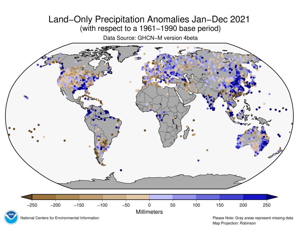 Das Jahr 2021 startete mit einem La Niña-Ereignis mit tiefen Wassertemperaturen im tropischen Ostpazifik. La Niña kühlt auch die Atmosphäre tendentiell etwas ab und so war der Februar 2021 global gesehen der kälteste der 12 Monate und zugleich der kälteste Februar seit 2014. Nach dem relativ kalten Februar fielen alle weiteren Monate deutlich wärmer aus. ![]() © by NOAA. Abweichungen der Temperaturen 2021 vom langjährigen Mittel der Jahre 1981-2010. In Nordamerika steht 2021 mit einer Abweichung von 1,4 Grad an siebenter Stelle der wärmsten Jahre. Neun der zehn wärmsten Jahre traten seit 2001 auf. Das Jahr startete bereits sehr mild, bevor es im Februar einen massiven Kälteeinbruch gab. Dabei würden in den kanadischen Prärien teilweise Höchsttemperaturen von -34 Grad gemessen. Nachts lag die Windchilltemperatur oft bei -45 bis -55 Grad und brach langjährige Rekorde. Die Folge waren große Schäden und Einschränkungen im öffentlichen Leben. Die Monate März und Juni bis Oktober gehörten jeweils zu den 10 wärmsten seit Aufzeichnungsbeginn. Der Juni war mit einer Abweichung von 2,0 Grad in Nordamerika der bisher wärmste registrierte erste Sommermonat. In Lytton in der kanadischen Provinz British Columbia wurde an drei aufeinander folgenden Tagen neue Temperaturrekorde aufgestellt, der Höchstwert liegt nun in bei 49,6 Grad. Große Teile des Ortes wurden durch ein Feuer vernichtet und durch die Hitze müssten im Westen Kanadas fast 800 Menschen in Krankenhäuser eingeliefert werden; viele starben sogar. Auch die Ernte litt unter Hitze und Trockenheit. Auf Hawaii würde das kühlste Jahr seit 2012 registriert. Ein neuer Temperaturrekord würde aus Mexiko gemeldet: In Mexicali im Nordwesten des Landes wurden am 03 08.2021 extrem heiße 50,4 Grad erreicht. In Südamerika war 2021 mit einer Abweichung von 1,1 Grad das sechstwärmste seit Aufzeichnungsbeginn. Es war zudem das 45. Jahr in Folge mit überdurchschnittlichen Temperaturen. Besonders warm war der September, der nach dem August 2015 die bisher zweithöchste Abweichung in einem Monat überhaupt aufwies. In Europa war 2021 mit einer Abweichung von 1,3 Grad das neuntwärmste Jahr seit Beginn der Aufzeichnungen. Die 10 wärmsten Jahre traten alle seit 2007 auf. Seit 1910 stieg die Temperatur um 0,15 Grad pro Jahrzehnt an, seit 1981 hat sich der Anstieg auf 0,45 Grad pro Jahrzehnt verdreifacht. Anders als im Rekordjahr 2020 lagen in 2021 sämtliche Monate über dem Durchschnitt. Dennoch wurden der kälteste April seit 2003 und der kühlste Mai seit 204 verzeichnet. In Teilen Sloweniens war es der kälteste April seit mehr als 100 Jahren. In Nova Vas im südlichen Slowenien wurde mit -20,6 Grad der alte Landesrekord aus dem April 1956 gebrochen. Es gab große Schäden an der Vegetation. Dagegen war der Juni 2021 nach 2019 der zweitwärmste. Der Juli war besonders in Nord- und Osteuropa sehr warm, europaweit landete der Juli auf Platz 3. In der zweiten Augustwoche erfasste eine extreme Hitzewelle Teile von Südeuropa und Nordafrika mit Höchsttemperaturen zum Teil über 45 Grad. Der Höchstwert von 48,8 Grad im sizilianischen Syrakus ist bislang nicht offiziell bestätigt - es wäre der bisher höchste gemessene Wert in Europa. Der alte Rekord war am 10.07.1977 mit 48,0 Grad an zwei Orten in Griechenland aufgestellt worden. In Österreich war 2021 das kühlste Jahr seit 2010. Es lag leicht unter dem Mittel der Jahre 1991-2020 und gehört trotzdem zu den 25 wärmsten seit 1768. Mit einer Abweichung von 1,33 Grad über dem Mittel war 2021 in Afrika das bisher drittwärmste Jahr seit Aufzeichnungsbeginn. Wärmer waren nur 2016 und 2010. Die 10 wärmsten Jahre traten alle seit 2005 auf. Auch in Afrika war 2021 das 45. Jahr in Folge mit überdurchschnittlichen Temperaturen. Rekordwärme brachten vor allem Januar, Juni und November. In Tunis (Tunesien, Nordafrika) wurden im August 49,0 Grad gemessen - ein neuer Augustrekord für Tunesien. In Asien lag die Abweichung bei 1,6 Grad über dem langjährigen Mittel der Jahre 1910-2000. Damit steht 2021 an 7. Stelle. Die ersten drei Monate waren nach Norden hin deutlich kälter, sonst eher wärmer als im Mittel. Bei einem kurzzeitigen Warmluftverstoß wurde am 20. Februar in Peking mit 20,8 Grad und direkt am folgenden Tag mit 25,6 Grad jeweils ein neuer Februarrekord gemessen. Die durchschnittliche Höchsttemperatur liegt in Peking im Februar bei 4 Grad. Auch in der südkoreanischen Stadt Pohang wurde mit 24,9 Grad ein neuer Februarrekord aufgestellt. Im Mai und im Sommer lagen die Temperaturen in weiten Teilen Asiens deutlich über dem Mittel. Der Juli war in Asien der wärmste seit Aufzeichnungsbeginn. Mit 24,6 Grad wurde in Hong Kong das bisher höchste Jahresmittel registriert. In Ozeanien lag die Temperatur dagegen nur 0,67 Grad über dem Mittel - das kühlste Jahr seit 2012. Vor allem der Herbst war recht kühl und der November war der kühlste seit 1999. ![]() © by NOAA. Abweichungen der Niederschläge 2021 vom langjährigen Mittel der Jahre 1981-2010. Am 20. Juli fielen in Zhengzhou in der chinesischen Provinz Henan 382 Liter Regen pro Quadratmeter und damit mehr als die Hälfte der durchschnittlichen Jahresmenge - innerhalb von nur 6 Stunden und 640 Liter innerhalb von vier Tagen. Die Folge waren massive Überschwemmungen und mehr als 20 Tote. Eine schwere Dürre herrschte in diesem Jahr im zentralen und südlichen Brasilien, sie entwickelte zu einer der schlimmsten Dürren der vergangenen Jahrhunderte. Die Folge waren gebietsweise Trinkwassermangel, ausbreitende Brände und Ernteverluste. Auch die Energieversorgung wurde beeinträchtigt, da Stauseen kaum noch gefüllt waren. Am 27. September verringerte ein Staubsturm in Sao Paulo die Sichtweiten drastisch. Anfang Oktober fielen in Norditalien enorme Regenmengen, die Überschwemmungen und Erdrutsche auslösten. Nach einer Meldung des italienischen Wetterdienstes kamen in Rossoglione, nördlich der Stadt Genua in Ligurien im