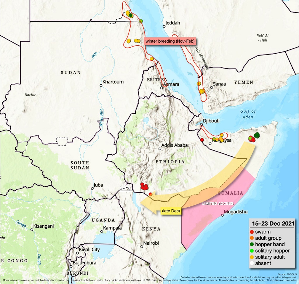 ![]() © by NHC. Die Karte zeigt die Zugbahnen aller Ostpazifikstürme im Jahre 2021 bis Ende September. ![]() © by Joint Typhoon Warning Center. Supertaifun "Goni" vor den Philippinen am 30.10.2020. ![]() © by USGS. Sehr schweres Erdbeben am 29.07.2021 vor Alaska. ![]() © by USGS. Schweres Erdbeben am 14.08.2021 in Haiti. ![]() © by NASA. Ausbruch auf La Palma im Herbst 2021. Die langsam fließende Lava richtete in drei Monaten gewaltige Schäden an Häusern, der Infrastruktur und auf Feldern an. Gebiete, die nicht von der Lava erreicht wurden, waren mit Asche überzogen. Nach einem Bericht des Copernicus Emergency Management Service hat der Vulkanausbruch mindestens 1.600 Häuser sowie mehrals 1.000 weitere Gebäude zerstört. Die Lava bedeckt eine Fläche von mindestens 12 Quadratkilometer. Nach vorsichtigen Schätzungen belaufen sich die Schäden auf mindestens 700 bis 900 Millionen Euro. Nach drei Monaten mit großen Lavaströmen und explosiver Tätigkeit gab es Mitte Dezember Anzeichen für ein Ende der Eruption. Am 14. Dezember nahm die Erdbebentätigkrit nach Messungen des Canary Islands Volcanology Institute (INVOLCAN) drastisch ab, ebenso die explosive Tätigkeit und der Ausstoß von Schwefeldioxid. Die Lavaströme bekamen zur Ruhe. An Weihnachten wurde das Ende der Eruption erklärt. ![]() © by NASA. Ausbruch des La Soufrière auf St. Vincent am 10.04.2021. ![]() © by FAO. Heuschreckenschwärme in Ostafrika und im angrenzenden Mittleren Osten im Dezember 2021. | ||||||||||||||||||||||||||||||||||||||||||||||||||||||||||||||||||||||||||||||||||||||||||||||||||||||||||||||||||||||||||||||||||||||||||||||||||||||||||||||||||||||||||||||||||||||||||||||||||||||||||||||||||||||||||||
