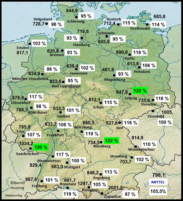 2021: Hurrikane, Tornados, Sturzfluten Weltweit haben Naturkatastrophen 2021 nach Angaben der Münchner Rückversicherung Munich Re erheblich höhere Schäden als in den beiden Vorjahren verursacht, besonders Hurrikane, Kältewellen und Tornados in den USA haben zu einer Gesamtschadensumme von etwa 280 Milliarden US-Dollar (Vorjahr: 210 Mrd.) beigetragen. Davon waren allerdings lediglich etwa 120 Milliarden versichert. Damit lag die Schadensumme deutlich höher als in den Vorjahren und damit etwa im Bereich der heftigen Jahr 2011 und 2005 (u.a. Hurrikan Katrina in den USA). Im bisherigen Rekordjahr 2017 waren es 146 Milliarden US-Dollar (inflationsbereinigt). Die teuerste Naturkatastrophe in 2021 war der Hurrikan IDA mit einer Schadensumme von 65 Milliarden US-Dollar, davon 36 Mrd. versichert. In Europa beliefen sich die Schäden nach der sommerlichen Flutkatastrophe auf etwa 54 Mrd. US-Dollar (46 Mrd. Euro) - damit handelte es sich um die bislang teuerste Naturkatastrophe in Deutschland. Fast 10.000 Menschen kamen 2021 bei Naturkatastrophen ums Leben und damit etwa mehr als in 2020 (8.200). ![]() Übersicht der weltweiten Schadenereignisse 2021, Quelle: Munich Re Der Anteil der Schäden in den USA an den Gesamtschäden war in 2021 sehr hoch, er lag bei 145 Milliarden US-Dollar, davon etwa 85 Mrd. versichert. Dazu trug besonders der Hurrikan IDA bei, der am 29. August und damit genau am Jahrestag des verheerenden Hurrikans KATRINA mit mittleren Windgeschwindigkeiten bis etwa 240 km/h (zweithöchste Kategorie 4 der fünfteiligen Hurrikanskala) auf den Süden der USA traf. Die Stadt New Orleans - 2005 durch KATRINA verwüstet - blieb zumindest von einer erneuten Überflutung verschont. Tausende Gebäude wurden aber beschädigt und im Nordosten der USA löste IDA schwere Überschwemmungen im Großraum New York und in New Jersey aus. Mindestens 114 Menschen starben durch den Hurrikan. Bereits im Februar hatte eine ungewöhnliche Kältewelle große Teile der USA im Griff und selbst in Houston im Süden von Texas wurden -8 Grad gemessen. Zeitweise waren Millionen Menschen ohne Strom. Die Schäden durch die Kältewelle beliefen sich auf etwa 30 Milliarden US-Dollar. Durch die Flutkatastrophe im Juli in Europa entstanden Schäden von etwa 46 Milliarden Euro, davon allein in Deutschland 33 Milliarden Euro. Davon war nur etwa ein Viertel versichert, da enorme Schäden unter anderem an der unversicherten Infrastruktur entstanden und vielfach keine Elementarschadenversicherung vorhanden war. Allein in Deutschland kamen mehr als 180 Menschen ums Leben. Eine für die Jahreszeit eher selten Gewitter- und Tornadoserie suchte im Dezember die Mitte und den Südosten der USA heim. Ein besonders schlimmer und für die Jahreszeit ungewöhnlicher Tornadoausbruch erfolgte am 10./11. Dezember. Betroffen waren unter anderem die Bundesstaaten Tennessee und Kentucky, wo in Mayfield extreme Schäden entstanden. Eine Kerzenfabrik und Teile eines Amazon-Lagers stürzten ein und begruben viele Menschen unter sich. Zwei sehr starke Tornados legten dabei eine Strecke von 130 und 266 Kilometer zurück. Mindestens 90 Menschen kamen durch die Tornados ums Leben. Die Schadensumme war für die Jahreszeit außergewöhnlich hoch mit etwa 5,2 Milliarden US-Dollar, davon etwa 4 Mrd. versichert. Die teuerste Naturkatastrophe in Asien war ein schweres Hochwasser in der chinesischen Provinz Henan, wo nach heftigen Regenfällen zahlreiche Flüsse über die Ufer traten. Die Schäden beliefen sich auf etwa 16,5 Milliarden US-Dollar, wovon nur ein sehr geringer Teil versichert war. Durch ein Erdbeben vor der japanischen Küste am 13. Februar entstanden Schäden in Höhe von 7,7 Milliarden US-Dollar. Der teuerste Vulkanausbruch war der Ausbruch der auf La Palma mit etwa 850 Millionen Euro, wovon kaum etwas versichert sein dürfte. ![]() © by Thomas Sävert In Deutschland war das Wetterjahr 2021 geprägt durch die Unwetterkatastrophe Mitte Juli im Westen und Südwesten Deutschlands. Mehr als 180 Menschen kamen durch das Hochwasser in Nordrhein-Westfalen und Rheinland-Pfalz ums Leben, die Schäden gingen weit in die Milliarden und es dauert Jahre, die Spuren der Verwüstung zu beseitigen. Auslöser war ein extremes Starkregenereignis, das in einigen Regionen gewaltige Regenmengen hervorbrachte und so kleinste Flüsse und Bäche innerhalb von Minuten auf Rekordniveau anschwellen ließ. Sehr schlimm war und ist die Lage entlang der Ahr, wo zahlreiche Häuser zerstört wurden. Abgesehen von dieser Extremwetterlage fiel das Jahr 2021 in Deutschland weitgehend durchschnittlich aus. In Erinnerung bleiben auch der Wintereinbruch im Februar mit starken Schneefällen, Eisregen und sibirischen Temperaturen in vielen Landesteilen, der kälteste April seit 40 Jahren und ein sommerlicher und sehr warmer Juni. Temperaturrekorde blieben aber im Sommer 2021 aus und das Regendefizit der vergangenen Jahre konnte zumindest etwas ausgeglichen werden. ![]() © Bernd Hussing, http://www.bernd-hussing.de/klima.htm Im Vergleich zum Mittel der Jahre 1991 bis 2020 schwankten die Temperaturen im Jahr 2021 meist um die Mittelwerte oder lagen leicht darunter. ![]() © Bernd Hussing, http://www.bernd-hussing.de/klima.htm Das Deutschlandmittel lag im Jahr 2021 bei 9,1 Grad und damit im oberen Mittelfeld der bis 1881 zurückreichenden Temperaturreihe. Im Vergleich zur Periode 1961 bis 1990 war das Jahr 2021 0,9 Grad wärmer und damit das elfte Jahr in Folge mit überdurchschnittlichen Temperaturen. Verglichen mit der neueren und wärmeren Periode 1991 bis 2020 lag das Jahr aber 0,2 Grad unter dem Durchschnitt. Die höchste Temperatur des Jahres 2021 wurde am 19. Juni in Berlin-Tempelhof und im etwa 50 km südlich gelegenen Baruth mit 36,6 Grad gemessen, der tiefste Wert am 10. Februar mit -26,7 Grad in Mühlhausen (Thüringen). ![]() © Bernd Hussing, http://www.bernd-hussing.de/klima.htm Im Norden fiel das Jahr 2021 gebietsweise trockener aus als im langjährigen Mitt