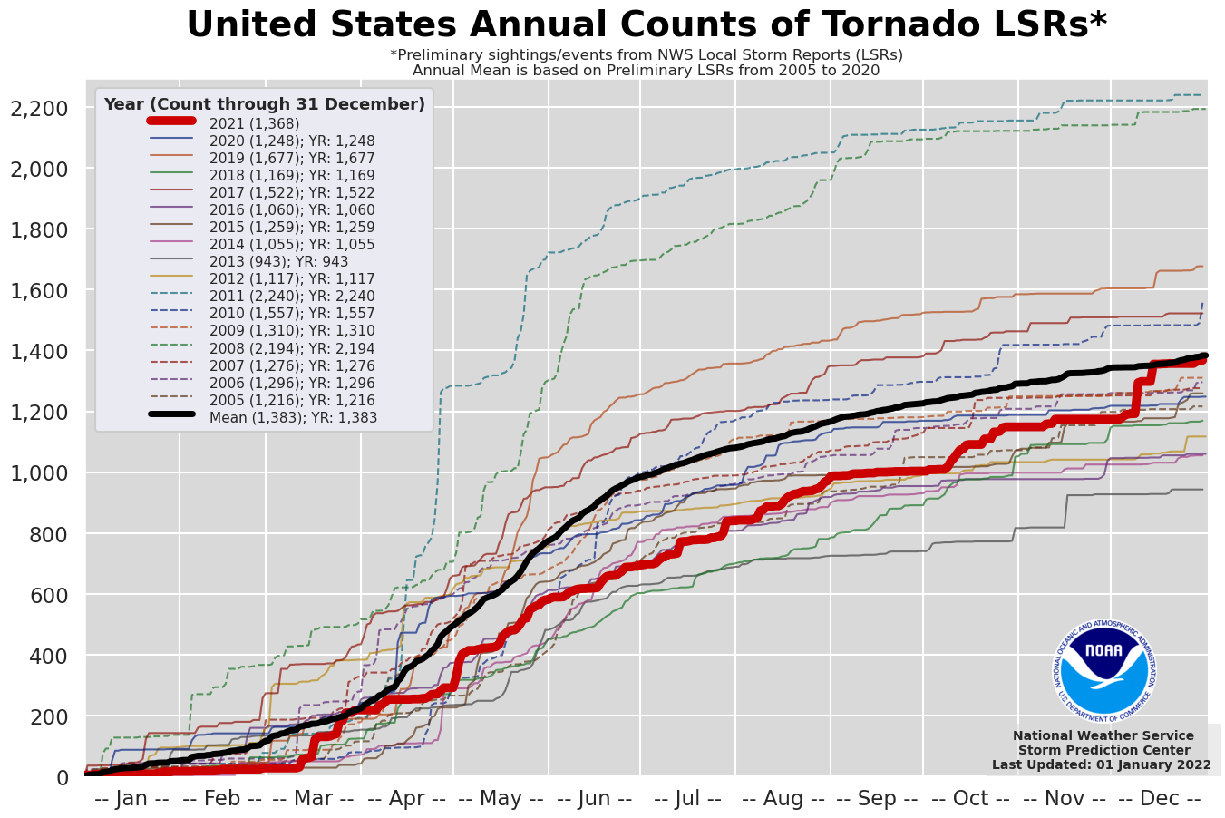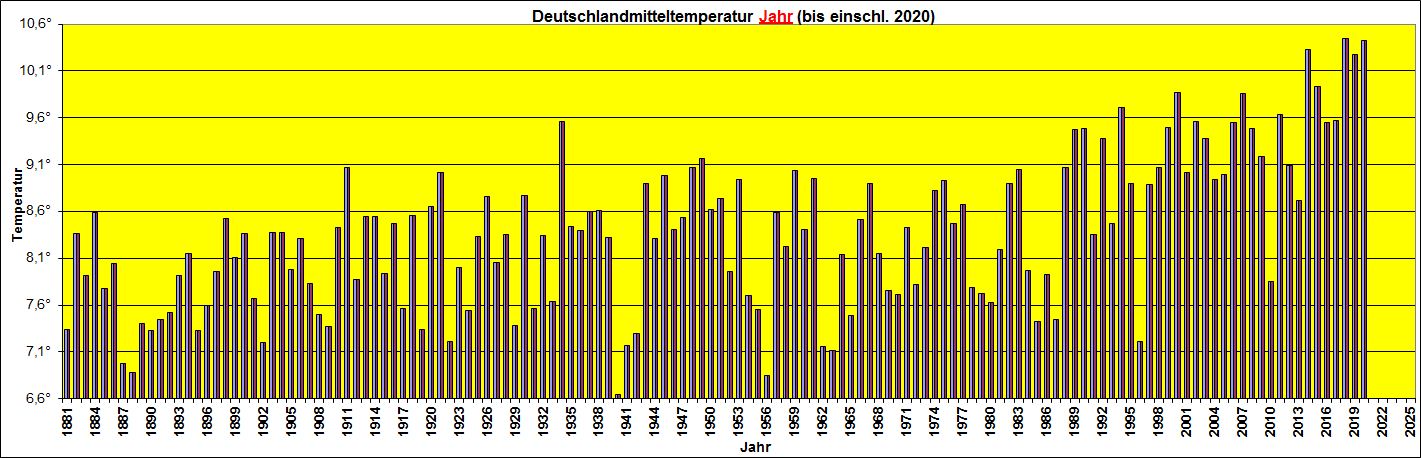 Nach Daten des US-Wetterdienstes NOAA war 2021 auf der Nordhalbkugel das sechstwärmste Jahr seit mindestens 1881. Betrachtet man nur die Landflächen, liegt 2021 sogar auf Platz 3 hinter 2020 und 2016. Auf der Südhalbkugel lag 2021 an neunter Stelle. Global lag die Mitteltemperatur 0,84 Grad über dem Mittel des 20. Jahrhunderts. Sämtliche Jahre von 2013 bis 2021 liegen in den Top 10 der bisher wärmsten Jahre. Außerdem war 2021 das 45. Jahr in Folge mit Temperaturen über dem Mittel des 20. Jahrhunderts. Dabei beschleunigt sich die Erwärmung immer mehr. Seit 1880 erwärmt sich die Luft global um 0,08 Grad pro Jahrzehnt, seit 1981 hat sich der Temperaturanstieg auf 0,18 Grad pro Jahrzehnt mehr als verdoppelt.