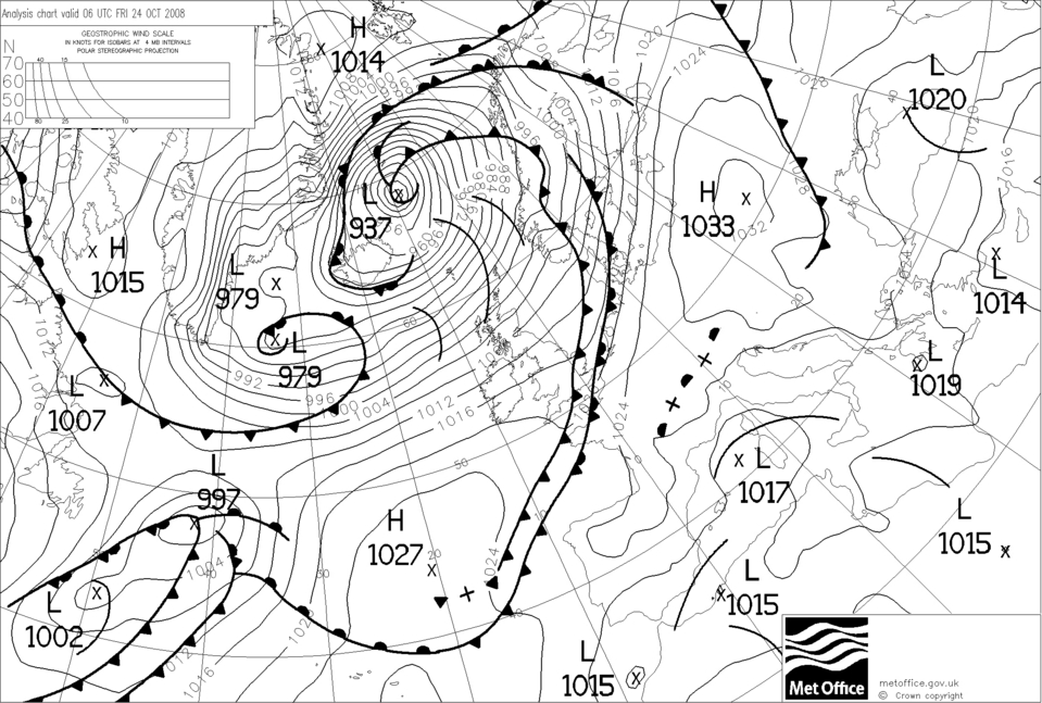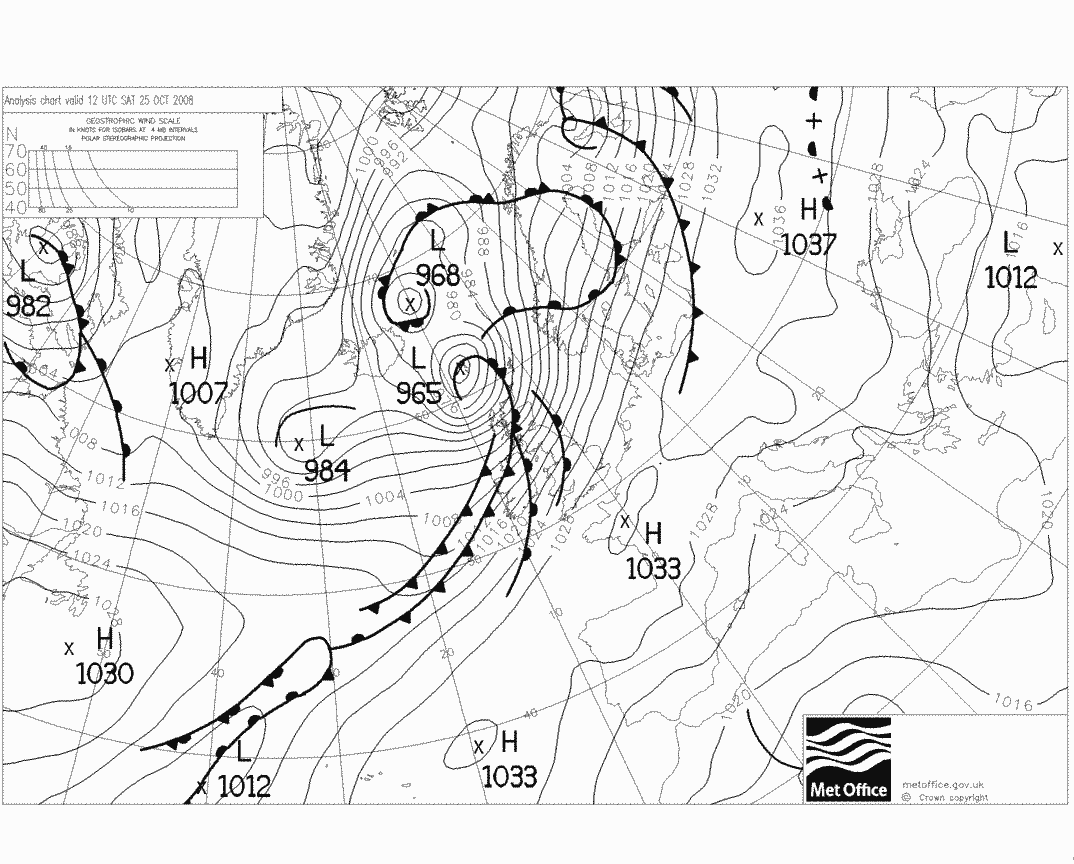 Orkantief "Xevera" am 25. Oktober 2008: Ein Orkantief zog vom Atlantik kommend nördlich an Schottland vorbei zum Nordmeer. Es beeinflusste vor allem Schottland und die Inseln nördlich davon. Berichte und Meldungen zum Sturm: Gales and heavy rain hit Scotland (BBC, 25.10.08) |
