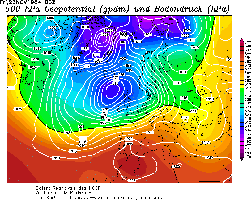 Wetterlage am 23. November 1984: An der Vorderseite eines umfangreichen Sturmtiefs mit Zentrum zwischen Island und Irland gelangte aus Sdwesten ungewöhnlich warme Luft nach Mitteleuropa. (Quelle der Karte links: Wetterzentrale) |