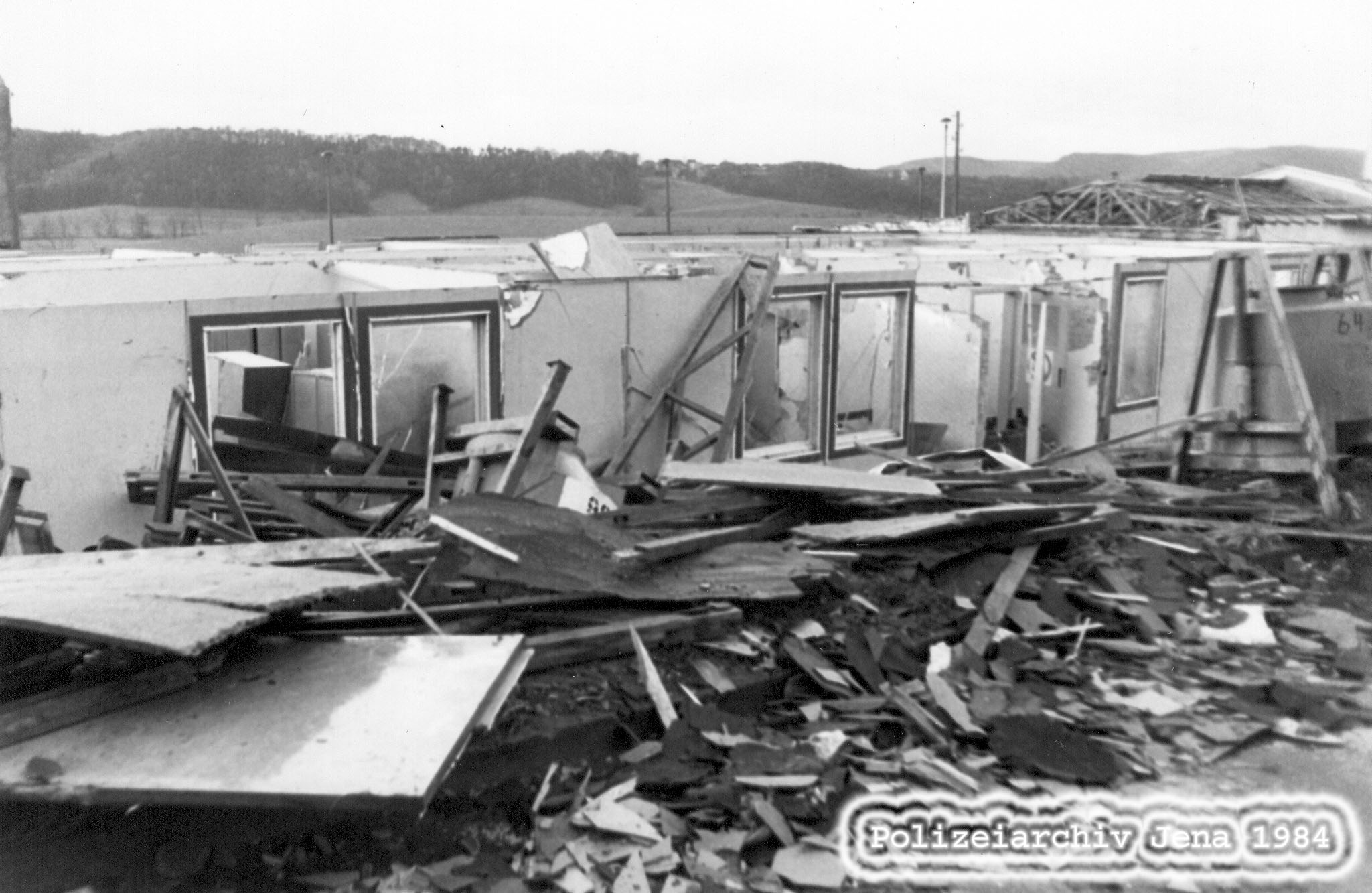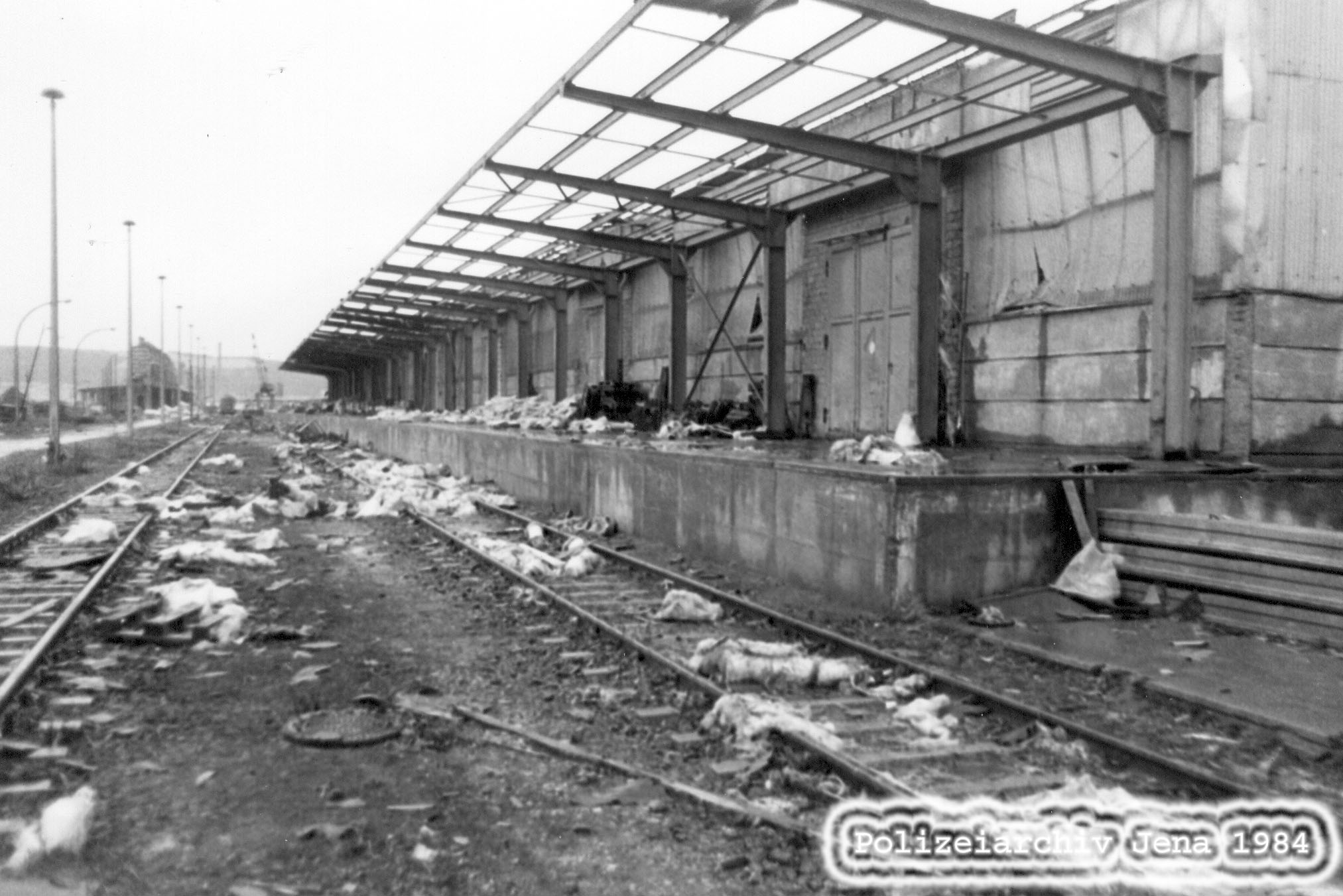 ![]() Baustofflager Neue Schenke 1 ![]() Baustofflager Neue Schenke 2 ![]() Verladestation ![]() Bus, mehrere Meter von der Straße versetzt ![]() Abgedeckter Sozialtrakt ![]() Garage davor Moskwitch ![]() Bahnhof ![]() Haus, 100m entfernt im Ort ![]() Trümmerfeld ![]() Eisenbahnwaggons © by Polizeiarchiv Jena 1984 |