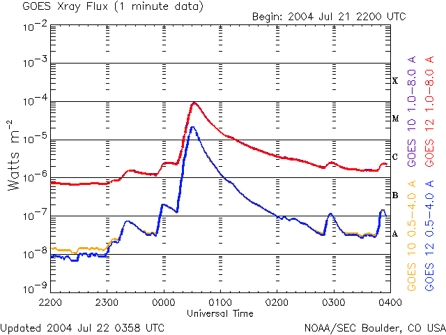 No.04/2004: 24./25. Juli 2004 | Ein weiterer starker Ausbruch (Stärke M9.1) erfolgte aus der Fleckengruppe mit der Nummer 10652 in der Nacht vom 21. zum 22. Juli. Dazu folgte die Ankunftsvorhersage mit der Ankunft der Schockfront am 24. Juli, 05:38 UTC. Nach anfänglicher Skepsis zahlreicher Fachleute erfolgten dann doch noch Warnungen für die folgende Nacht. Bernitt bei Rostock von Wolfgang Hamburg (ACHTUNG: 10MB-Video) Frankfurt/Oder von Michael Heiß Beobachtungsberichte im Michael Heiß |