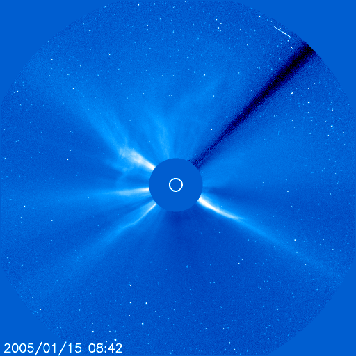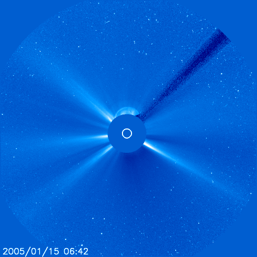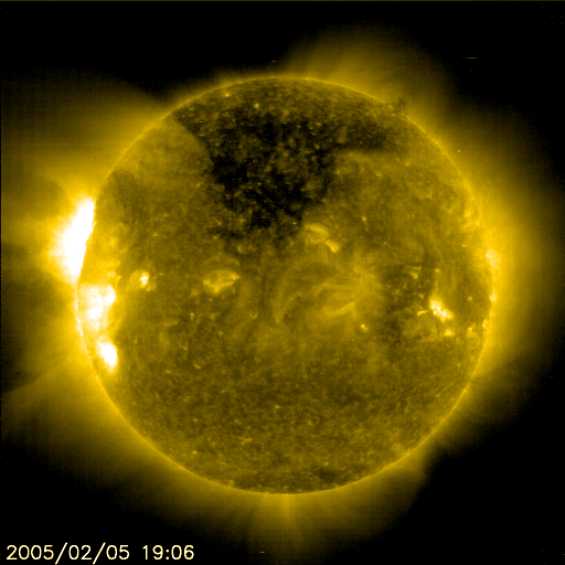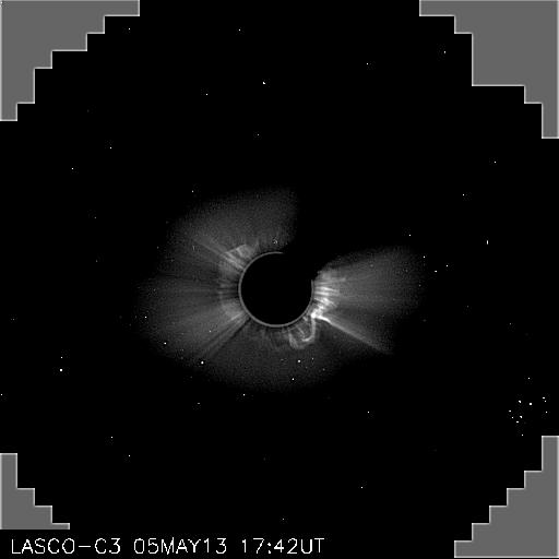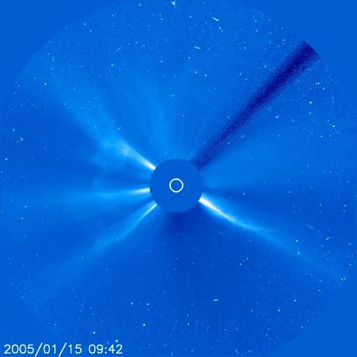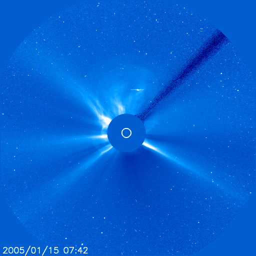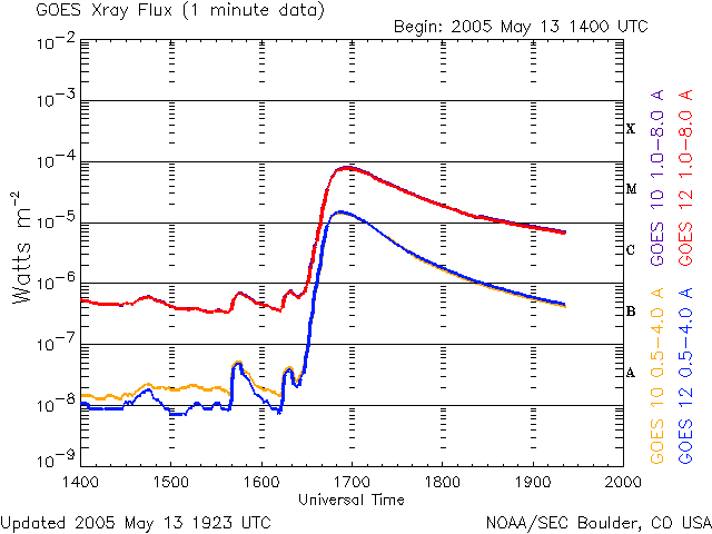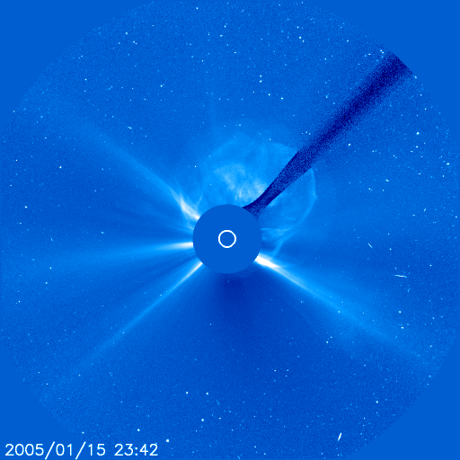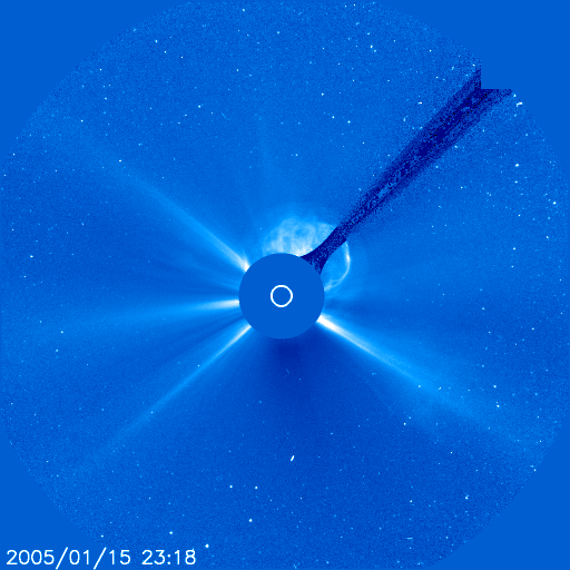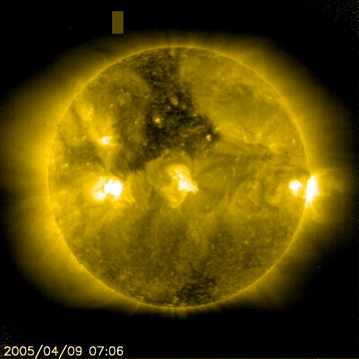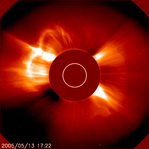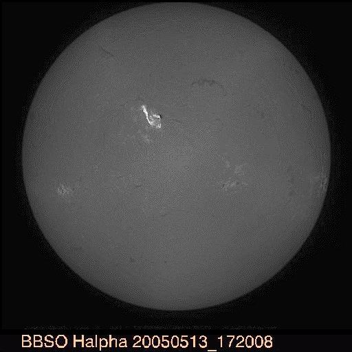 Keine Sichtung: 15./16. Mai 2005 | Am 13. Mai erfolgte auf der Sonne ein starker Ausbruch (Weitere Grafik). Urspungsort war die Fleckengruppe 10759, die sich zum Zeitpunkt des Ausbruchs fast genau in der Mitte der sichtbaren Sonnenscheibe befand.![]() ![]() ![]() ![]() (Zum Vergrößern bitte anklicken) Das Halpha-Bild oben links zeigt die Aufhellung im Bereich der Fleckengruppe 10759, die nahezu in der Sonnenmitte stand. Auf den weiteren Bildern sieht man das Herausschleudern der Teilchenwolke in fast alle Richtungen, also direkt erdgerichtet. Trotz der optimalen Lage der Fleckengruppe gab es in Mitteleuropa keine Polarlichtsichtungen. Die Schockfront traf für Europa zu einem sehr ungünstigen Zeitpunkt ein, dagegen gab es in Nordamerika zahlreiche Sichtungen. Diskussion im Polarlichtforum Bilder aus den USA: Aurora Gallery von Spaceweather.com |