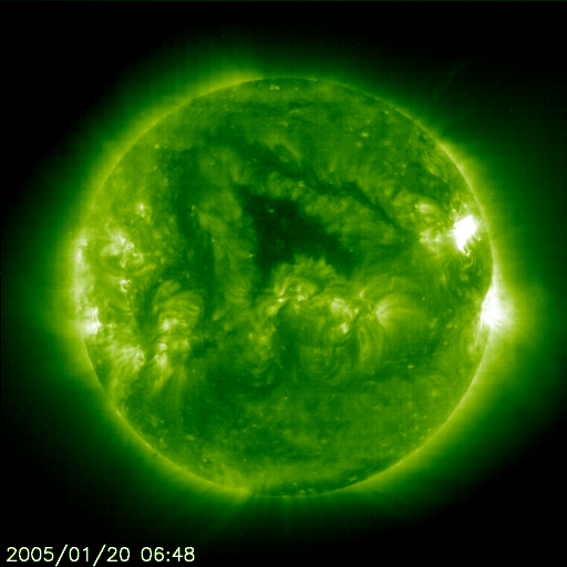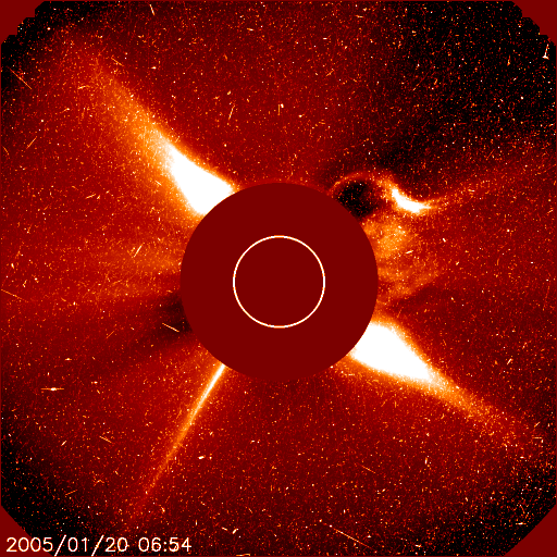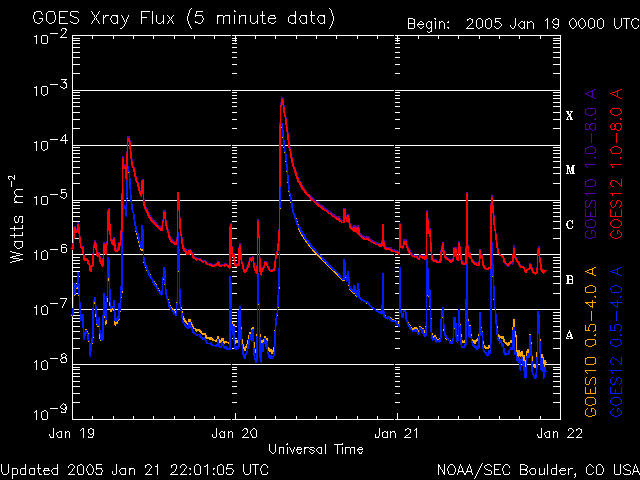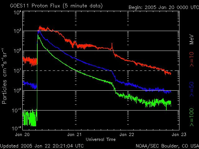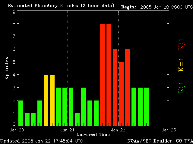 No.01/2005: 17. Januar 2005 ![]() © by Rene Winter | Am 15. und 16. Januar gab es aus der schnell gewachsenen Fleckengruppe 720 mehrere starke Ausbrüche.![]() ![]() (Zum Vergrößern bitte anklicken) Weitere Bilder von 08:42 UTC, 09:42 UTC, 23:18 UTC und 23:42 UTC Es waren zunächst zwei Teilchenwolken auf dem Weg von der Sonne zur Erde. Die erste Schockfront kam sehr ungünstig am Morgen des 17. Januar an, sie traf um 08:16 Uhr MEZ auf den vorgelagerten ACE-Satelliten und wirkte sich tagsüber mitteleuropäischer Zeit auf das Erdmagnetfeld aus. Die zweite Teilchenwolke hat sich dagegen kaum bemerkbar gemacht. Am Abend des 17. ließen die Auswirkungen nach, eine Polarlichtsichtung liegt aber u.a. aus Thüringen vor. Da die Wetterbedingungen sehr schlecht waren, gab es in Mitteleuropa sonst kaum Sichtungsmeldungen. Eschenbergen, Thüringen von Rene Winter |