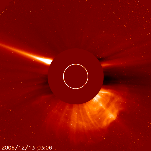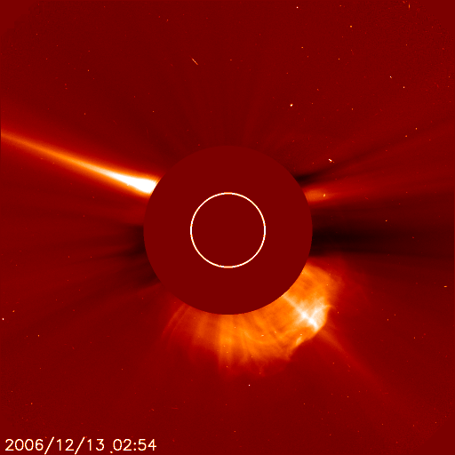 No.04/2006: 14./15. Dezember 2006 ![]() © by Martin Wagner ![]() © by Thorsten Böckel ![]() © by Mark Vornhusen | Ein ungewöhnliches Polarlichtereignis gab es mitten im Dezember 2006: Nach zwei sehr starken Ausbrüchen am Rande der sichtbaren Sonnenscheibe folgte am 13. Dezember (Maximum um 03:39 Uhr MEZ) ein weiterer sehr starker Ausbruch der Stärke X3.4. Urspungsort war die Fleckengruppe 930, die sich zum Zeitpunkt der Eruption noch recht nahe zur Mitte der sichtbaren Sonnenscheibe befand. Das Aufblitzen im Bereich der Sonnenfleckengruppe ist gut zu erkennen in diesem Bild.![]() ![]() (Zum Vergrößern bitte anklicken) Auf den Bildern (Quelle: SOHO) vom Mittwochvormittag (13.12.) sieht man das Herausschleudern der Teilchenwolke, allerdings vornehmlich in Richtung Südwesten (rechts unten auf den Bildern). Dennoch war der Ausbruch teilweise erdgerichtet. Dazu hier noch die MIDDLE LATITUDE AURORAL ACTIVITY WARNING von 06:15 UTC am 13. Dezember. Die Schockfront traf am 14.12. um 13:53 UTC (14:53 Uhr MEZ) auf den vorgelagerten ACE-Satelliten und kurz darauf auf das Erdmagnetfeld. In der Nacht zum 15.12. waren damit auch in Teilen Mitteleuropas schwache Polarlichter zu sehen. Zu den Beobachtungen: Beobachtungen und Fotos im Polarlicht-Forum Langgöns, Taunus von Rolf Kole Schönfeld bei Dresden (kontrastverstärkt) von Tobias Felber Stuttgart von Martin Wagner Maisach bei Fürstenfeldbruck von Thorsten Böckel Gais, Schweiz von Mark Vornhusen Weitere Fotos weltweit: Aurora Gallery by spaceweather.com Fotos aus Norwegen Medienmeldungen zum Ereignis: Schwerer Magnetsturm droht von Heise |