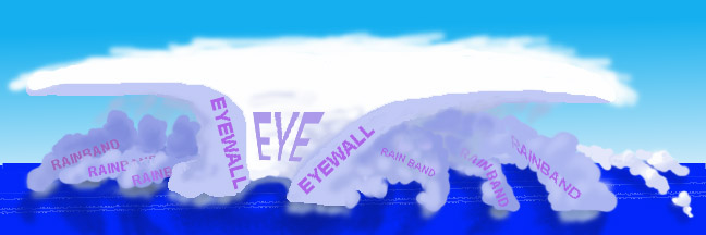 Das Auge ist umgeben von der "eyewall", einem nahzu kreisförmigen Ring mit hochreichenden Schauern und Gewittern und den höchsten Windgeschwindigkeiten innerhalb des tropischen Wirbelsturmes. Das Auge ist angefüllt mit Luft, die langsam absinkt, und die eyewall besteht aus teilweise heftigen Auf- und Abwinden. Die relativ hohen Temperaturen innerhalb des Auges entstehen durch das Absinken und Zusammendrücken der Luft. Läßt man hier einen Wetterballon aufsteigen, dann registriert man zunächst feuchte und weiter oben trockenere Luft. Das liegt daran, dass das Absinken nicht bis zum Boden reicht, sondern nur bis etwa 1-3 km über dem Boden. Wie das Auge genau entsteht, ist noch etwas umstritten. Eine Idee besagt, dass sich das Auge durch den abwärts gerichteten Luftdruckgradienten ausbildet, in Zusammenhang mit dem sich mit der Höhe abschwächenden Windfeld (Smith, 1980). Eine andere Hypothese nimmt an, dass das Auge entsteht, wenn in der Eyewall Wärme frei wird und im Zentrum des Sturms eine absinkende Luftströmung erzeugt. (Shapiro and Willoughby, 1982). Es kann durchaus sein, dass sich diese beiden Theorien widersprechen. In beiden Fällen wird die Luft, wenn sie absinkt, zusammengedrückt, sie erwärmt sich gegenüber Luft in der Umgebung in gleicher Höhe und steigt wieder etwas auf. Durch diese Gegenbewegung wird ein Teil des Absinkens ausgeglichen und das tatsächliche Absinken wird durch einen kleinen Überschuss an Kraft erzeugt. Damit das Auge sich bilden und fortbestehen kann, ist auch die Konvektion (Schauer und Gewitter) in der eyewall wichtig. Die Konvektion in tropischen Wirbelstürmen ist in langen schmalen Bändern angeordnet, die in die gleiche Richtung zeigen wie der Bodenwind. Weil diese Bänder wie eine Spirale zum Zentrum des tropischen Wirbelsturms gerichtet sind, nennt man sie oft Spiralbänder. Entlang dieser Bänder herrscht am Boden Konvergenz (Zusammenströmen) und in der Höhe meist Divergenz (Auseinanderströmen). Ein Kreislauf entsteht, in dem feuchtwarme Luft am Boden zusammenströmt, dann in den Bändern aufsteigt und in der Höhe wieder auseinander strömt. Zu den Seiten hin sinkt die Luft wieder ab, dabei erwärmt sie sich und trocknet aus. Das Gleiche passiert im Zentrum eines Bandes, hier aber auf engstem Raum konzentriert, mit entsprechend starker Erwärmung. Dadurch entsteht innerhalb des Bandes ein Temperatur- und Druckgradient, weil warme Luft leichter ist als kalte. Wegen des Druckfalls im Zentrum des Bandes nimmt der Wind in der Umgebung zu. Schließlich wandert das Band in Richtung Zentrum und umkreist es - das Auge und die eyewall bilden sich (Willoughby 1979, 1990a, 1995). Also wird das Absinken im Zentrum eines tropischen Wirbelsturms und damit das wolkenfreie Auge durch 2 Prozesse bestimmt: Die Zentrifugalkraft transportiert Luft aus dem Auge in die eyewall und erzeugt damit Absinken im Auge. Gleichzeitig bewirkt die Konvektion in der eyewall ebenfalls ein Absinken im Zentrum. Diese Vorgänge müssen noch näher untersucht werden, um herauszufinden, welcher Prozess vorherrschend ist.