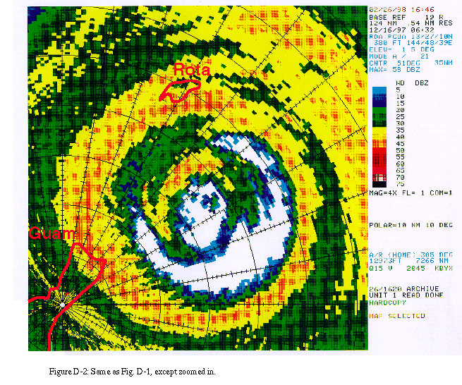 Das "Auge" ist ein nahezu kreisrundes Gebilde mit vergleichsweise schwachen Winden und freundlichem Wetter im Zentrum eines starken tropischen Wirbelsturmes. Hier ist es häufig windstill und nahzu wolkenlos. Auch wenn es in der Mitte der Zirkulation weitgehend windstill ist, so können einzelne Böen weit in das Auge hinein gelangen. Es fällt wenig bis kein Niederschlag und manchmal ist der Himmel blau oder Sterne zeigen sich. Das Auge ist das Gebiet mit dem niedrigsten Luftdruck und den höchsten Temperaturen. In höheren Luftschichten - in etwa 12 km Höhe - kann die Luft im Auge 10 Grad wärmer sein als in der Umgebung, während der Unterschied am Boden nur bis zu 2 Grad beträgt (Hawkins and Rubsam 1968). Der Durchmesser des Auges reicht von etwa 8 km bis über 200 km, beträgt aber meist 30-60 km (Weatherford and Gray 1988).