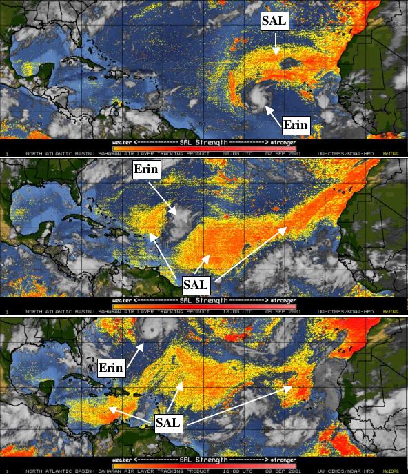 ![]() Hurrikan "Erin" und die SAL im Jahre 2001 zusammengestellt von Jason Dunion Die Sahara-Luftschicht (Saharan Air Layer, SAL) ist eine Masse sehr trockener, staubiger Luft, die sich im späten Frühjahr, im Sommer und im frühen Herbst über der Sahara bildet und normalerweise alle 3 bis 5 Tage auf den tropischen Atlantik hinaustreibt. Die SAL befindet sich meist in einer Höhe zwischen 1.500 und 6.000 Metern (5.000 bis 20.000 Fuß) in der Atmosphäre und ist verbunden mit großen Mengen kleinster Staubteilchen, trockener Luft (etwa 50 Prozent weniger Feuchtigkeit als in einer typischen tropischen Atmosphäre) und starkem Wind (etwa 40 bis 90 km/h oder etwa 10 bis 25 m/s oder etwa 25 bis 55 mph). Diese starken Winde oder Jetstreams sind normalerweise anzutreffen in einer Höhe zwischen 2000 und 4500 Meter (6.500 bis 14.500 Fuß) über dem zentralen und westlichen Nordatlantik. Sie erstrecken über ca. 1,6 bis 3,2 km Höhe (ca. 1-2 Meilen). Die SAL kann einen deutlich negativen Einfluss auf die Stärke und Entstehung von tropischen Wirbelstürmen haben. Die trockene Luft kann einen tropischen Wirbelsturm abschwächen, indem sie den Aufwind im Sturm beeinträchtigt, während der starke Wind die vertikale Windscherung im Bereich des Sturms und in seiner Umgebung erhöhen kann. Noch ist nicht ganz klar, welchen Einfluss der Staub der SAL auf die Intensität eines tropischen Wirbelsturmes hat, obwohl einige neuere Studien nachgewiesen haben, dass sich die SAL auf die Wolkenbildung auswirkt. Das obige Beispiel zeigt die Entwicklung des Hurrikans "Erin" im Sepember 2001: Im obersten Bild ist der Sturm gut entwickelt mit deutlich erkennbaren Spiralbändern um das Zentrum herum. Durch den Einfluss der SAL ist er im mittleren Bild zerfallen und hat sich fast aufgelöst. Erst als er nicht mehr durch die SAL beeinflusst wurde (Bild unten), konnte er sich zu einem voll ausgebildeten Hurrikan mit einem ausgeprägten Auge verstärken. Die SAL kann sich über ein Gebiet von der Größe der USA erstrecken und wurde schon bis in die Karibik, bis nach Zentralamerika und bis zum Golf von Mexiko verfolgt. Echtzeit-Satellitenbilder, auf denen die SAL beobachtet werden kann, finden Sie hier. Einen ausführlichen Artikel zum Einfluss des Saharastaubes auf die Hurrikanaktivität gibt es in englischer Sprache: Saharan Dust Has Chilling Effect on North Atlantic (NASA, 14.12.07) Referenzen:
