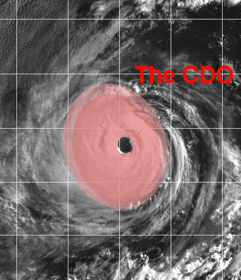 Die Abkürzung "CDO" steht für "central dense overcast" (Dünne Wolkenschicht im Bereich des Zentrums). Gemeint ist eine dünne Schicht aus Cirren (Schleierwolken), die durch Gewitter innerhalb der "eyewall" (Ring um das Auge) und im Bereich äußerer Regenbänder entstehen. Bevor ein tropischer Wirbelsturm Hurrikanstärke (118 km/h oder 64 Knoten) erreicht, erscheint typischer Weise die CDO, während noch kein Auge sichtbar ist. Sobald der Sturm Hurrikanstärke erreicht, bildet sich normaler Weise ein Auge, das dann auf den Satellitenbildern zu erkennen ist. Tropische Wirbelstürme mit einer nahezu kreisförmigen CDO weisen meist nur geringe Scherung auf und verstärken sich in den meisten Fällen. |