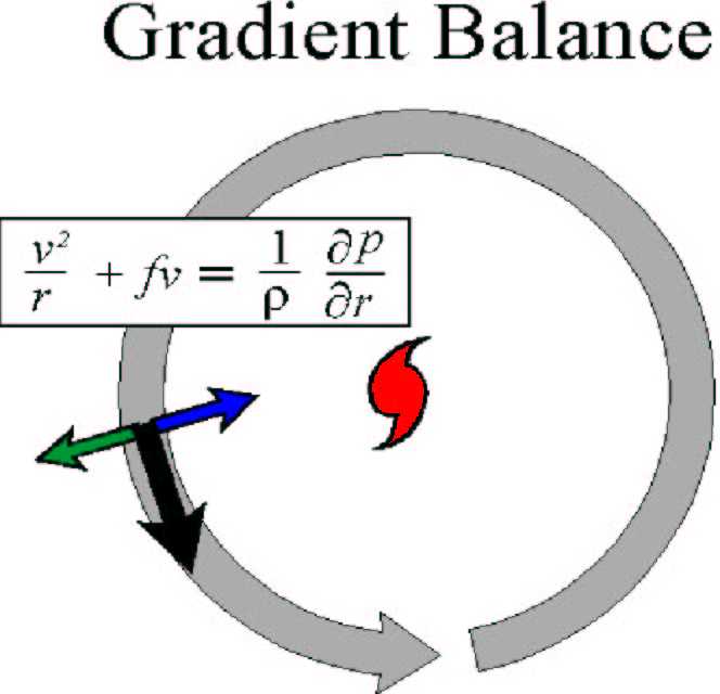 zusammengestellt von Chris Landsea Die Windgeschwindigkeiten im Bereich eines Hurrikans hängen direkt vom Luftdruckgradienten (Luftdruckunterschied) ab. Entscheidend ist die Differenz zwischen dem Kerndruck im Zentrum des Sturmes oder Hurrikans und dem Luftdruck am Rande des Systems. Je größer die Differenz pro Strecke, desto stärker der Druckausgleich und damit der Wind. Das bedeutet aber auch für einen festen Kerndruck: Je größer der Sturm oder je geringer der Druck am Rande, desto geringer die Druckdifferenz und damit auch die Windgeschwindigkeiten. Zur physikalischen Erklärung: In einem tropischen Wirbelsturm besteht oberhalb der Grundschicht ein Gleichgewicht zwischen der Summe aus der Coriolisbeschleunigung und der Zentripetalbeschleunigung sowie der horizontalen Druckgradientkraft. Diese Bilanz wird als Gradientbilanz bezeichnet, wobei die Coriolisbeschleunigung definiert ist als die horizontale Geschwindigkeit eines Luftpakets v mal dem Coriolis-Parameter f. Die Zentripetalbeschleunigung ist definiert als die Beschleunigung, die auf ein Luftpaket wirkt, das sich auf einer Kurvenbahn in Richtung Zentrum der gebogenen Bahn bewegt mit der Größe v2/r, wobei v die horizontale Geschwindigkeit des Pakets und r der Radius der Kurvenbahn sind. Die Zentripetalkraft verändert die ursprüngliche geostrophische Zwei-Kräfte-Bilanz und erzeugt einen nichtgeostrophischen Gradientwind. Der Grund dafür, dass unterschiedliche Windspitzen aus unterschiedlichen Luftdruckminima im Zentrum hervorgehen, liegt darin, dass der Radius r der stärksten Winde variiert. Ein Sturm mit höchsten Windgeschwindigkeiten von 40 m/s in einem Radius von 100 Kilometern weist einen viel stärkeren Druckabfall auf als einer mit einem Radius von nur 25 Kilometern.