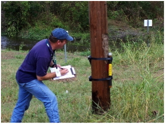 Dies sind die Linien, die an Bäumen und Gebäuden zu sehen sind. Sie markieren den Höchststand des Wassers bei einem Hochwasserereignis. Sie werden durch Schaum, Samen und andere Trümmer erzeugt. Vermessungsteams auchen nach einem Sturm zuverlässige Hochwassermarken auf und halten sie fest. Mit GPS werden die genauen Standorte ermittelt, die dann relativ zu einer vertikalen Bezugsebene aufgetragen werden.