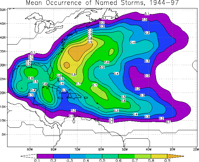 Die Karte (erstellt von Todd Kimberlain) zeigt die Anzahl der Tropischen Stürme und Hurrikane, die im langjährigen Mittel einen Ort zwischen Juni und November treffen. Herangezogen wurden die Jahre 1944 bis 1997. Ein Treffer wurde gezählt, wenn ein Sturm oder Hurrikan sich auf mindestens 165 Kilometer (100 Meilen) näherte.