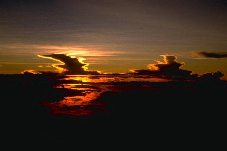 Aber wenn das Flugzeug in das stille Auge eines Hurrikans wie "Andrew" oder "Gilbert" gelangt, dann erleben wir einen Ort von unbeschreiblicher Schönheit. Die Sonnenstrahlen scheinen durch die Fenster des Flugzeuges von einem perfekt blauen Himmel direkt über dem Flugzeug. Umgeben ist das Flugzeug auf allen Seiten von dunklen, schwarzen Gewitterwolken der eyewall,