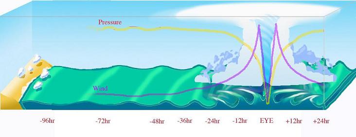 So wie jeder Mensch ein Individuum ist, so ist auch jeder Hurrikan anders. Jedes Erlebnis mit einem solchen Sturm ist einzigartig. Die folgende Zusammenfassung soll den allgemeinen Ablauf darstellen, wie man einen Hurrikan der Kategorie 2 erlebt, der sich der Küste nähert. Was Sie im Einzelnen erleben, kann aber auch ganz anders sein. Vor allem bei schnell ziehenden Hurrikanen erfolgt der gesamte Ablauf wesentlich schneller und der Luftdruck fällt kurz vor der Ankunft des Hurrikanzentrums sehr rasch, um direkt darauf extrem schnell wieder anzusteigen.