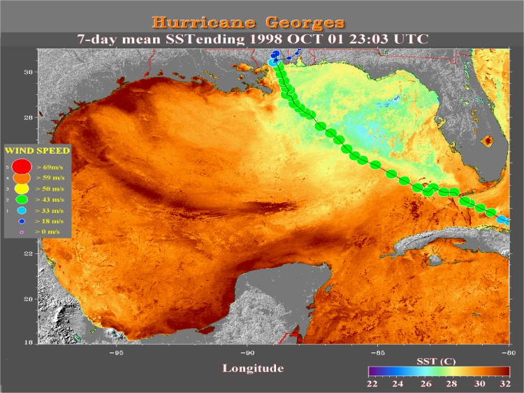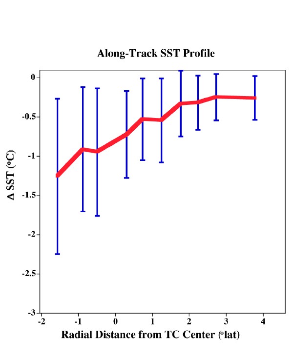 Ein wichtiger Einwand ist allerdings, dass der größte Teil der Abkühlung um 3-5°C (6-9°F), der in Abbildung 1 gezeigt wird, dann auftritt, wenn der Sturm die Region bereits verlassen hat (in diesem Fall einige Tage nachdem "Georges" an Land gegangen ist). Die Größenordnung der Abkühlung, die direkt unter dem Hurrikan im Bereich der Starkwindregion des Sturms auftritt, ist eine viel wichtigere Frage, auf die Wissenschaftler eine Antwort finden wollen. Warum? Hurrikane beziehen ihre Energie aus dem warmem Ozeanwasser unter ihnen. Um eine genauere Abschätzung darüber zu erhalten, wie viel Energie vom Ozean in die Atmosphäre transportiert wird, müssen Wissenschaftler die Wassertemperaturverhältnisse direkt unter dem Hurrikan kennen. Unglücklicherweise sind direkte oder auch indirekte Messwerte der SSTs aus dem inneren Bereich eines Hurrikans sehr rar, da Windgeschwindigkeiten von 160 km/h und mehr (100 mph+), Wellen von 20 Metern Höhe und mehr sowie dichte Bewölkung die Messungen erheblich erschweren. "Sehr rar" bedeutet zum Glück nicht, dass man einen solchen Messwert nur einmal während eines Menschenlebens erhält. Inzwischen sind Wissenschaftler der Hurricane Research Division (HRD) in der Lage, ein besseres Bild darüber zu erhalten, wie stark die Abkühlung direkt unter einem Hurrikan ist, indem sie zahlreiche Stürme in einem Zeitraum von 28 Jahren näher untersuchten. Sie fügten diese seltenen Ereignisse zu einem durchschnittlichen Gesamtbild der Abkühlung direkt unter dem Hurrikan zusammen.