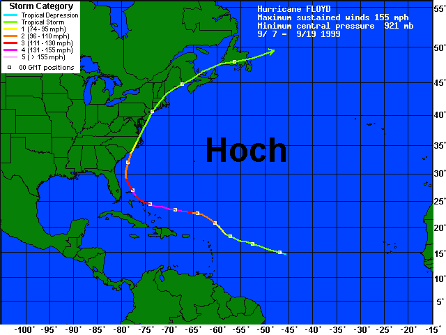 ![]() Hurrikan Floyd 1996 (Weather Underground) Die meisten Tropischen Stürme und Hurrikane werden an der Südseite des subtropischen Hochs zunächst nach Westen geführt. An der Westseite des Hochs drehen sie oft nach Nordwesten bis Norden, später auch nach Nordosten ein. Damit gelangen die Hurrikane in die mittleren Breiten und wandeln sich hier häufig in außertropische Tiefs um, die auch das Wetter in Teilen Europas beeinflussen können. Allerdings sind damit höchstens einige Sturmböen und etwas stärkere Regenfälle verbunden.