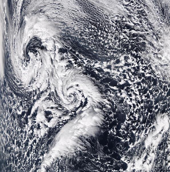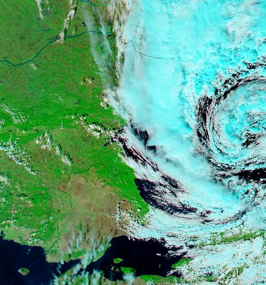 Auch im Mittelmeerraum haben sich manchmal schon hurrikanähnliche Tiefs gebildet. Der Entstehungsmechanismus entspricht dem bei tropischen Hurrikanen: Nicht horizontale Temperaturgegensätze sind für die Tiefbildung verantwortlich, sondern das Freisetzen latenter Energie über dem warmen Wasser eines Meeres ohne störende starke Höhenwinde. Die Wassertemperaturen sind zwar meist nicht so hoch wie in den Tropen, dafür ist die Corioliskraft größer; sie entsteht durch die Erddrehung und löst die Drehbewegung um ein Tiefzentrum aus. Solche hurrikanähnlichen Gebilde wurden im September 1947, September 1969, Januar 1982, September 1983 und vom 13. bis zum 17. Januar 1995 beobachtet. Einige Untersuchungen dieser Stürme wurden veröffentlicht von Mayengon (1984) und Ernest and Matson (1983). The January 1995 Mediterranean "Hurricane" (Dr. Jack Beven) Genesis and maintenance of Mediterranean hurricanes (K. Emanuel) 6th Plinius Conference on Mediterranean Storms (2004) Medicane: Alles Wissenswerte zum Hurrikan im Mittelmeer (ADAC) Mittelmeerwirbel am 18.10.07 vor Ostspanien SCHWARZES MEER: ![]() Besonders im Herbst können sich auch über dem Schwarzen Meer hurrikanähnliche Wirbel bilden, so Ende September 2005 (Bild: NASA). Satellitenbild vom 28.09.05 (MODIS) Weiteres Satellitenbild vom 27.09.05 (MODIS) GREAT LAKES (Große Seen): In seltenen Fällen sind auch auf den Großen Seen im Nordosten der USA schon hurrikanähnliche Tiefs aufgetreten. Hurricane Huron (AMS) POLARTIEFS: In den arktischen Regionen werden im Spätherbst und im Winter oft kleinräumige, hurrikanähnliche Wirbel beobachtet. Sie entstehen, wenn hochreichend kalte Luft über relativ warmes Wasser strömt. Dann kann sich ein solcher kurzlebiger Wirbel bilden, der manchmal auch ein Auge im Zentrum aufweist und sich mit heftigen Schneestürmen auf Inseln oder Ölbohrplattformen auswirken kann. Im europäischen Raum treten sie besonders vor Nordnorwegen auf. ![]() (Zwei Polartiefs am 11. Februar 2006 im Beringmeer, Quelle: NASA) Polar low (Wikipedia, englisch) Hurrikane über der Arktis (Süddeutsche Zeitung, 17.05.10)
